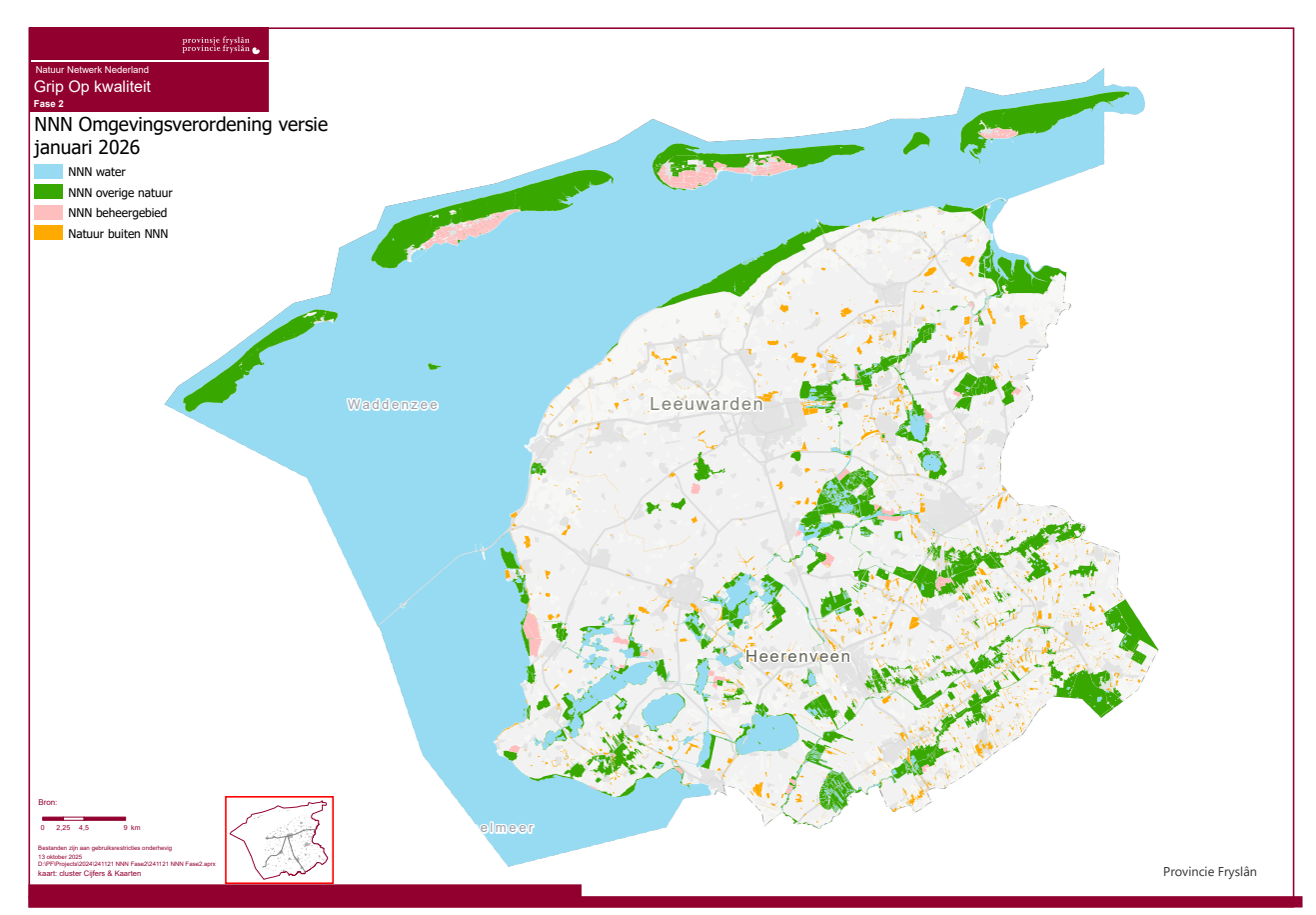 In afdeling 2.11 ‘Natuurgebieden natuurnetwerk Nederland’ (artikel 2.37 en verder) van de Omgevingsverordening Fryslân 2022 (hierna: omgevingsverordening) zijn deze nadere regels opgenomen. De gebieden die het natuurnetwerk Nederland (hierna: NNN) in de provincie Fryslân vormen zijn geometrisch vastgelegd op een kaart in Bijlage 2.4 van de Omgevingsverordening.