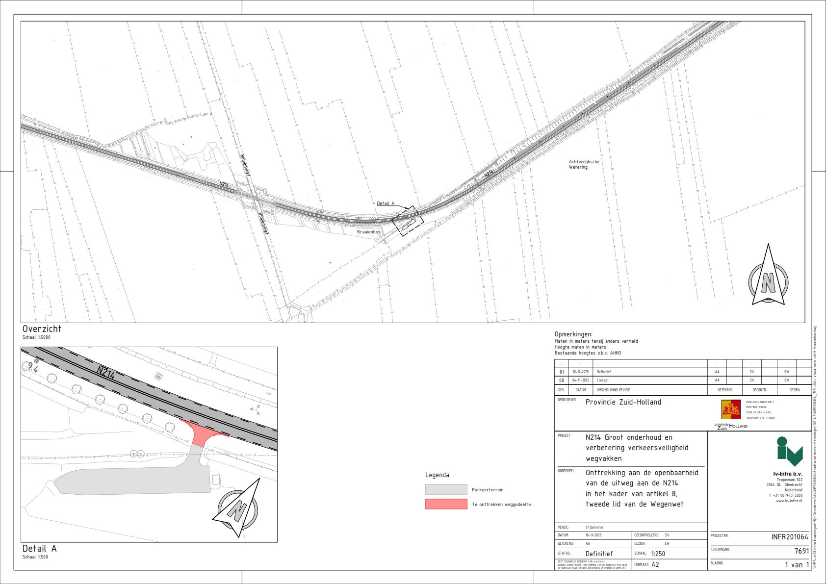 dat aan de N214 in de gemeente Molenlanden ter hoogte van hectometerpunt 9.5 een uitrit aanwezig is die aansluit op een parkeerplaats. In het verleden was deze parkeerplaats nog in beheer bij de provincie Zuid-Holland. Een aantal jaar geleden heeft de provincie Zuid-Holland deze parkeerplaats verkocht aan een particuliere eigenaar, die een natuurplan en een recreatief oogmerk had. Achter de parkeerplaats lig het natuurgebied Kraaibos. De eigenaar heeft sinds een paar jaar de toegang naar het parkeerterrein dichtgezet met betonblokken vanwege ongewenst gebruik. Er is een alternatieve toegang vanaf het Oosteinde (Wijngaarden), naar het natuurgebied Kraaibos, waarvan lokale bezoekers al gebruik van maken.