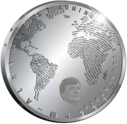 • a. op de voorzijde, overeenkomstig onderstaande afbeelding: onderaan in het midden Onze beeltenis, rondom het omschrift «WILLEM-ALEXANDER KONING DER NEDERLANDEN», geheel zichtbaar de continenten Zuid-Amerika en Afrika en deels zichtbaar de continenten Noord-Amerika en Europa, voorts bovenaan in het midden de letters «tm», zijnde de initialen van de ontwerpster Tine Melzer: