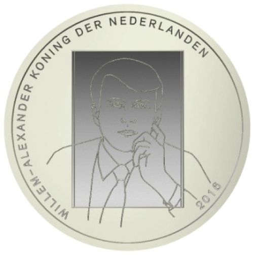 • a. op de voorzijde, overeenkomstig onderstaande afbeelding: in het midden Onze beeltenis gezien in een spiegel met langs de rand de tekst «WILLEM-ALEXANDER KONING DER NEDERLANDEN» en rechtsonder langs de rand het jaartal «2016»: