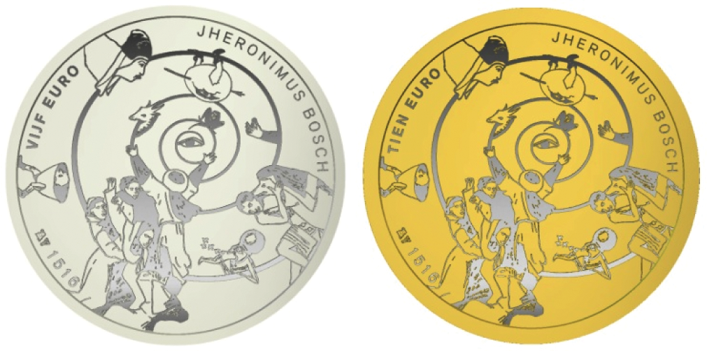 • b. op de keerzijde, overeenkomstig onderstaande afbeeldingen: boven het midden een afbeelding van een oog die aan de rechterzijde uitloopt naar een spiraalvormige lijn, langs de spiraalvormige lijn zijn diverse fragmenten uit schilderijen van Jheronimus Bosch afgebeeld met rechtsboven langs de rand de tekst «JHERONIMUS BOSCH», linksboven langs de rand de waardeaanduiding «VIJF EURO» respectievelijk «TIEN EURO» en linksonder langs de rand het jaartal «1516», met links hiervan het teken van de Muntmeester en het teken van het Munthuis :