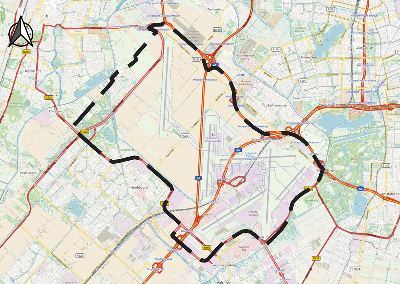 • de autosnelweg A9 (komende uit de richting Alkmaar en gaande in de richting Amstelveen) gelegen tussen de afrit N205 en de afrit Aalsmeer / Schiphol-oost.