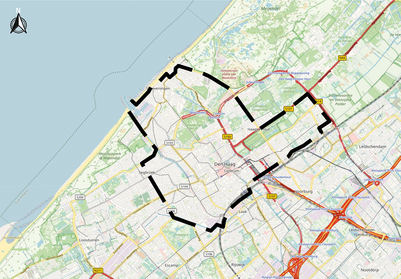 Houtrustweg tot aan het strand, Haven, inclusief 1e en 2e binnenhaven, Zeesluisweg, Strandweg, Zwolsestraat, Van Alkemadelaan, Benoordenhoutseweg, Landscheidingsweg, Margarethaland, Finnenburg, Schenkkade, Schenkviaduct, Rijswijkseplein, Waldorpstraat, Calandstraat, Parallelweg, Fruitweg, Troelstrakade, Soestdijksekade, Zuiderparklaan, Valkenboskade, Loosduinsekade, Valkenboskade, Hanenburglaan, Segbroeklaan en Houtrustweg.