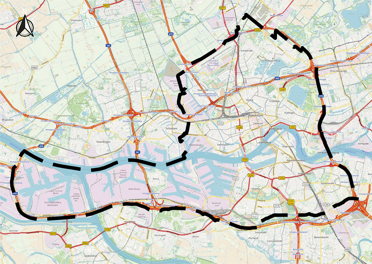 • Gebied ten westen van A16 tussen knooppunt Terbregseplein en knooppunt Ridderkerk.