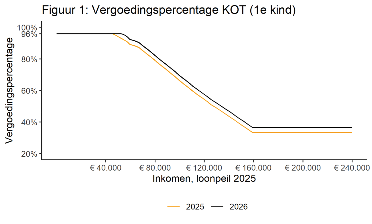 In artikel 8, derde lid, van het Besluit kinderopvangtoeslag is vastgelegd vanaf welk toetsingsinkomen de ouder voor de kosten van kinderopvang van het eerste kind een kinderopvangtoeslag ontvangt ter hoogte van 36,5 procent van die kosten. Dit percentage (de vaste voet) is met ingang van 2026 verhoogd van 33,3 procent naar 36,5 procent. De inkomensgrens wordt met ingang van 2026 veranderd in € 165.658. Ouders met een toetsingsinkomen van € 165.658 en hoger krijgen een tegemoetkoming ter hoogte van de vaste voet (36,5 procent).