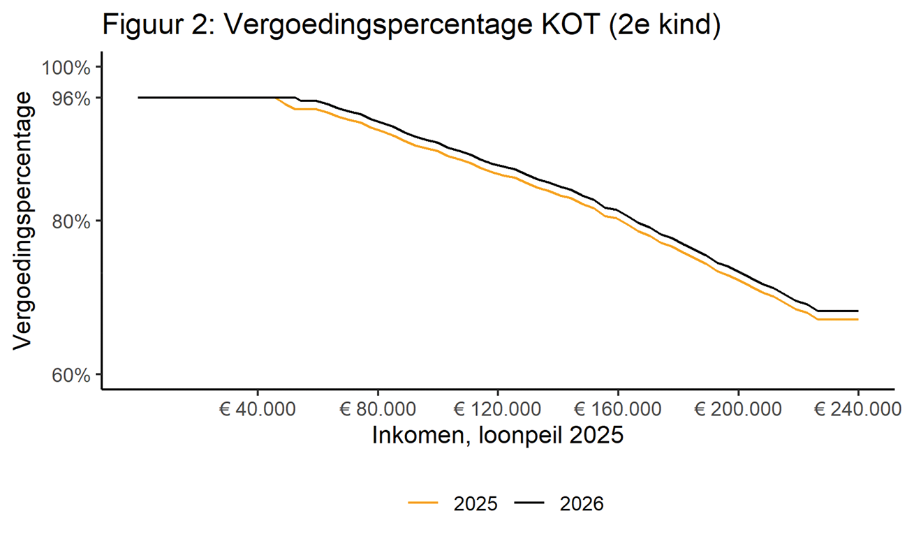 Bovenstaande rekenvoorbeelden zijn gebaseerd op een voorbeeldsituatie met twee kinderen die beiden twee dagen per week naar de dagopvang gaan voor een verwacht mediaan tarief van € 11,00 in 2025 en € 11,53 in 2026.13 Het enige waar de voorbeelden in verschillen is de hoogte van het toetsingsinkomen. De in de tabellen genoemde bedragen zijn in lopende prijzen.