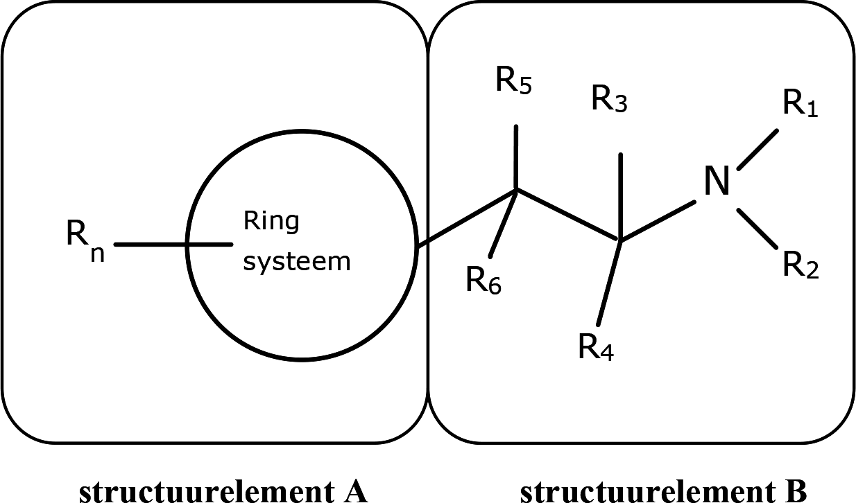 De 2-amino-ethyl zijketen van structuurelement B kan gesubstitueerd worden met de volgende atomen, atoomgroepen of ringsystemen: