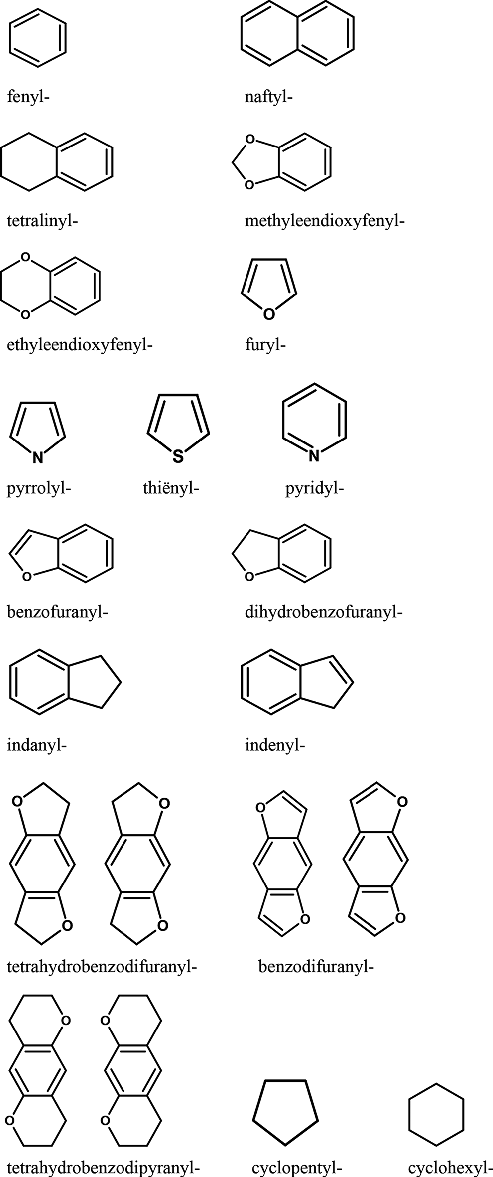 fenyl-, naftyl-, tetralinyl-, methyleendioxyfenyl-, ethyleendioxyfenyl-, furyl-, pyrrolyl-, thiënyl-, pyridyl-, benzofuranyl-, dihydrobenzofuranyl-, indanyl-, indenyl-, tetrahydrobenzodifuranyl-, benzodifuranyl-, tetrahydrobenzodipyranyl-, cyclopentyl-, cyclohexyl-