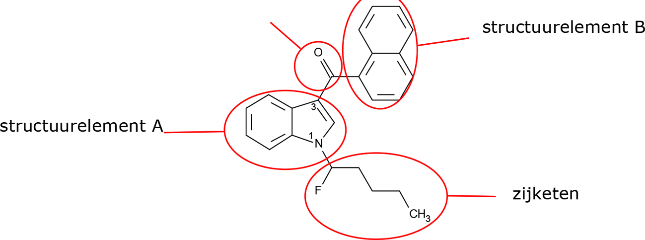 Figuur 3 geeft de modulaire opbouw van 1-fluor-JWH-018 weer.