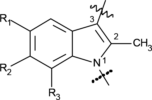 b) 2-methylindol-1,3-diyl (bindingsplaats voor de brug op positie 3, bindingsplaats voor de zijketen op positie 1) |