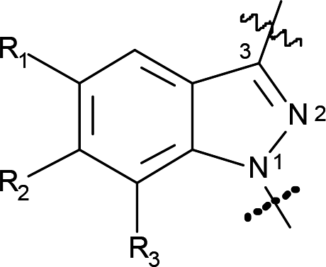 c) Indazol-1,3-diyl (bindingsplaats voor de brug op positie 3, bindingsplaats voor de zijketen op positie 1) |