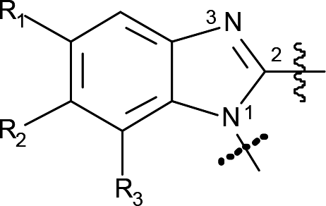 d) Benzimidazol-1,2-diyl-isomeer I (bindingsplaats voor de brug op positie 2, bindingsplaats voor de zijketen op positie 1) |