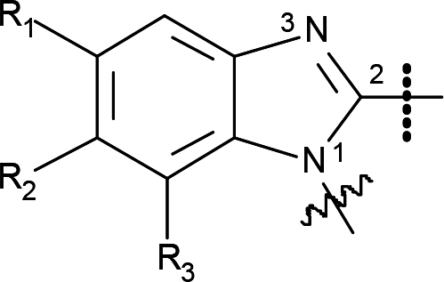 e) Benzimidazol-1,2-diyl-isomeer II (bindingsplaats voor de brug op positie 1, bindingsplaats voor de zijketen op positie 2) |