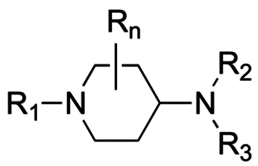 Daarnaast kan de piperidinering op elke positie gesubstitueerd zijn met de volgende atomen of atoomgroepen (Rn): fluor, chloor, broom, jood, hydroxy, alkyl, aryl, alkoxy, alkoxycarbonyl of heterocyclische ringstructuur.