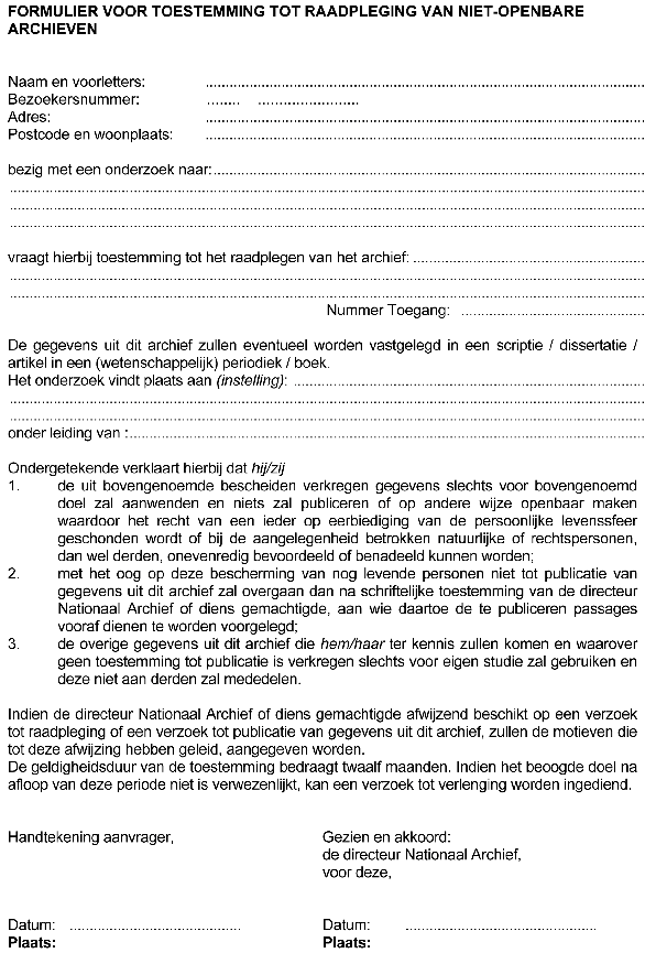 Raadpleging of gebruik van de archiefbescheiden geborgen onder de inventarisnummers, genoemd in artikel 1, is slechts mogelijk na voorafgaande schriftelijke toestemming van de directeur van het Nationaal Archief. Indiening van een verzoek tot inzage geschiedt door ondertekening door de verzoeker van het ‘Formulier voor toestemming tot raadpleging van niet openbare archieven’; een exemplaar van dit formulier is als bijlage bij dit besluit gevoegd. De directeur kan aan zijn toestemming voorwaarden verbinden.