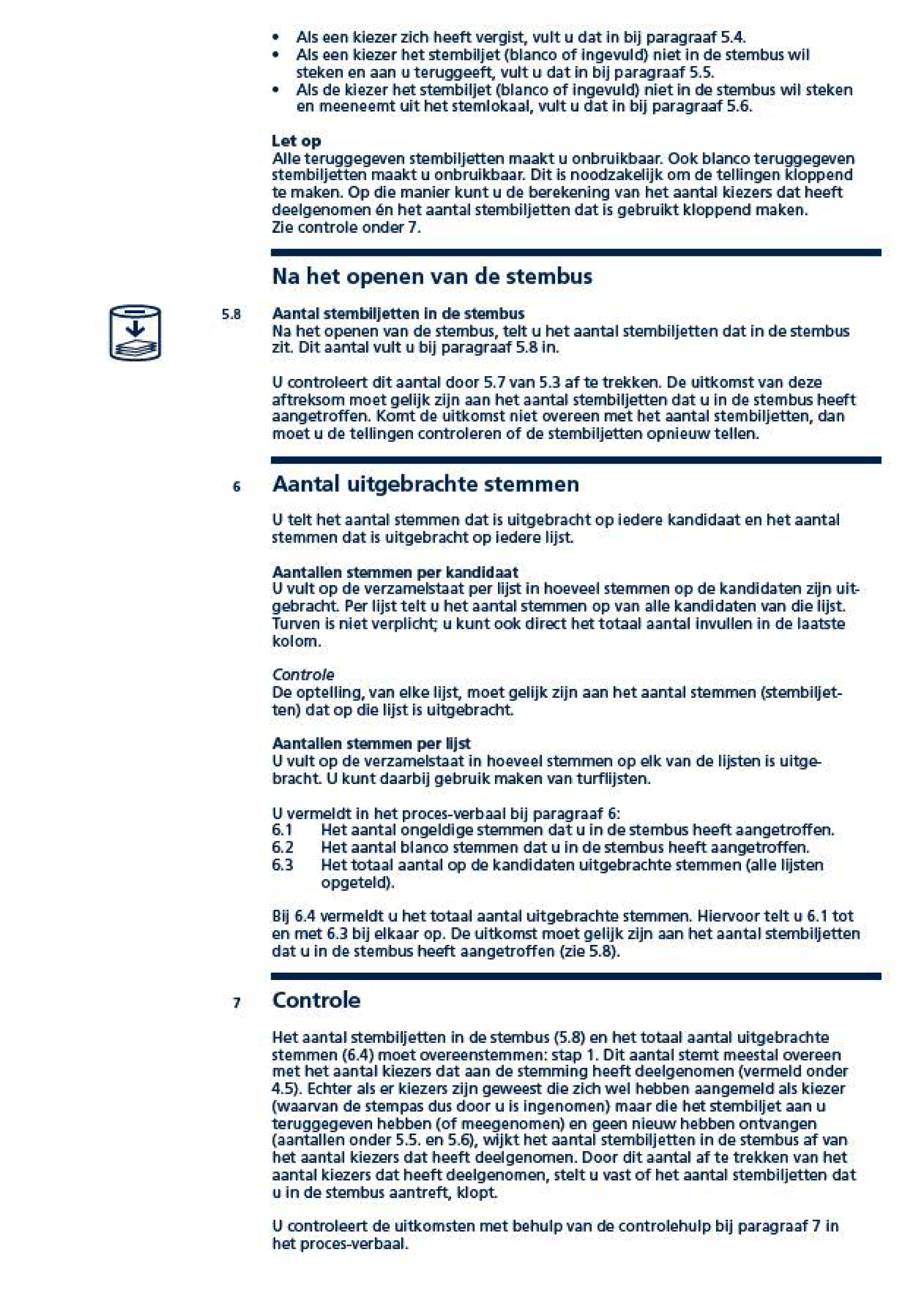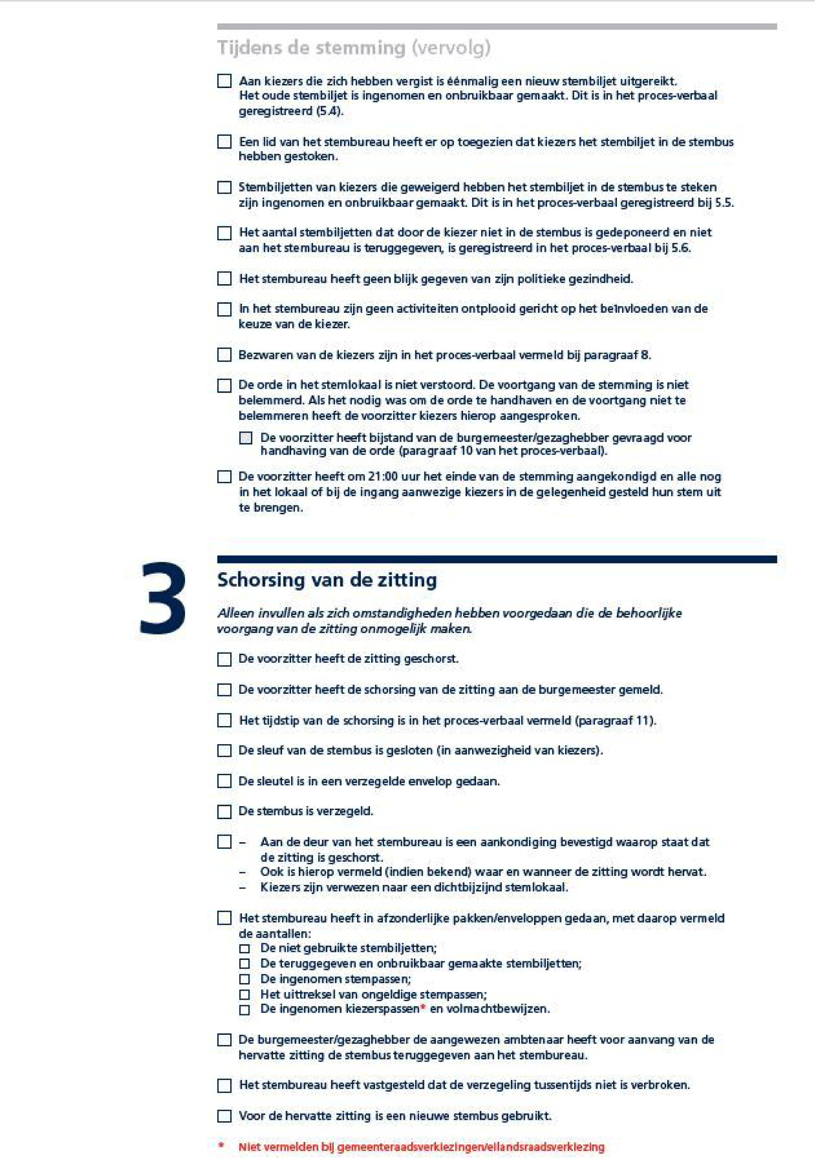 Indien de zitting tijdens de stemopneming is geschorst, nadat de stembus is geopend, wordt deze zin vervangen door: Alle stembiljetten die zich in de stembus bevonden, zijn daarin teruggedaan.