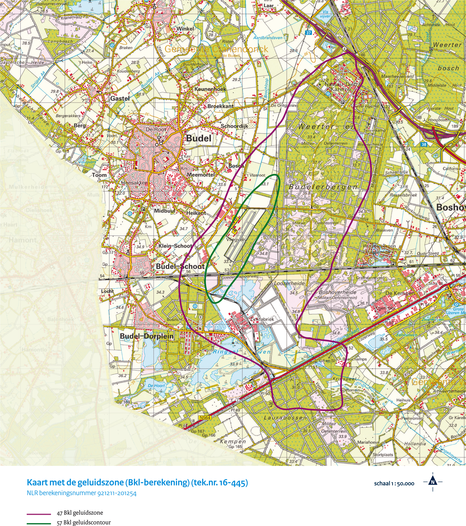 Aangezien er bij de luchthaven Budel ook een 35 Ke-zone is, waarbinnen echter geen aaneengesloten woongebied is gelegen, worden alleen handhavingspunten in het verlengde van de baan opgenomen. Bij de berekening van deze handhavingspunten is de invoerset voor bepaling van de 47 Bkl- en de 35 Ke-geluidszone uit het aanwijzingsbesluit gebruikt. Op grond van de ten tijde van de aanwijzing geldende Luchtvaartwet werd de Bkl-zone vastgesteld voor luchtvaartuigen met een startmassa van minder dan 6.000 kg, het zogenaamde klein verkeer. In deze invoerset is uitgegaan van 110.000 vliegbewegingen van klein verkeer, 1.100 bewegingen met helikopters en 800 bewegingen van groot verkeer per jaar op de luchthaven Budel.