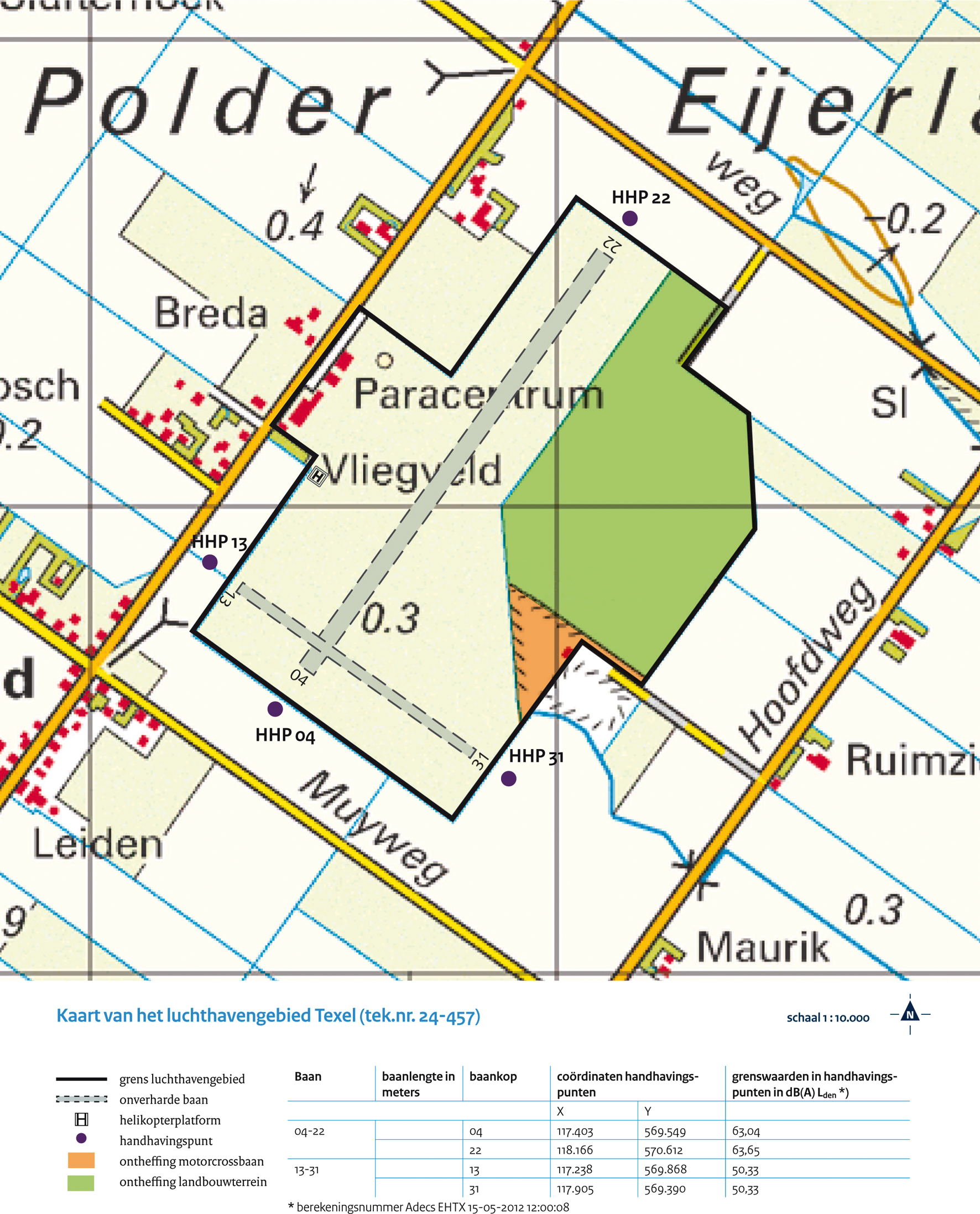 De luchthaven Texel heeft naast een Bkl-zone ook een 35 Ke-zone. Aangezien binnen deze zone geen aaneengesloten woongebied is gelegen, worden alleen handhavingspunten in het verlengde van de baan opgenomen. Bij de berekening van de grenswaarden in deze handhavingspunten is de invoerset voor bepaling van de 47 Bkl- en de 35 Ke-geluidszone uit het aanwijzingsbesluit gebruikt. Op grond van de ten tijde van de aanwijzing geldende Luchtvaartwet werd de Bkl-zone vastgesteld voor luchtvaartuigen met een startmassa van minder dan 6.000 kg, het zogenaamde klein verkeer. In deze invoerset is uitgegaan van 46.040 vliegbewegingen, waarvan 43.000 bewegingen van klein verkeer, 2.920 bewegingen met helikopters en 120 bewegingen van groot verkeer per jaar op de luchthaven Texel.