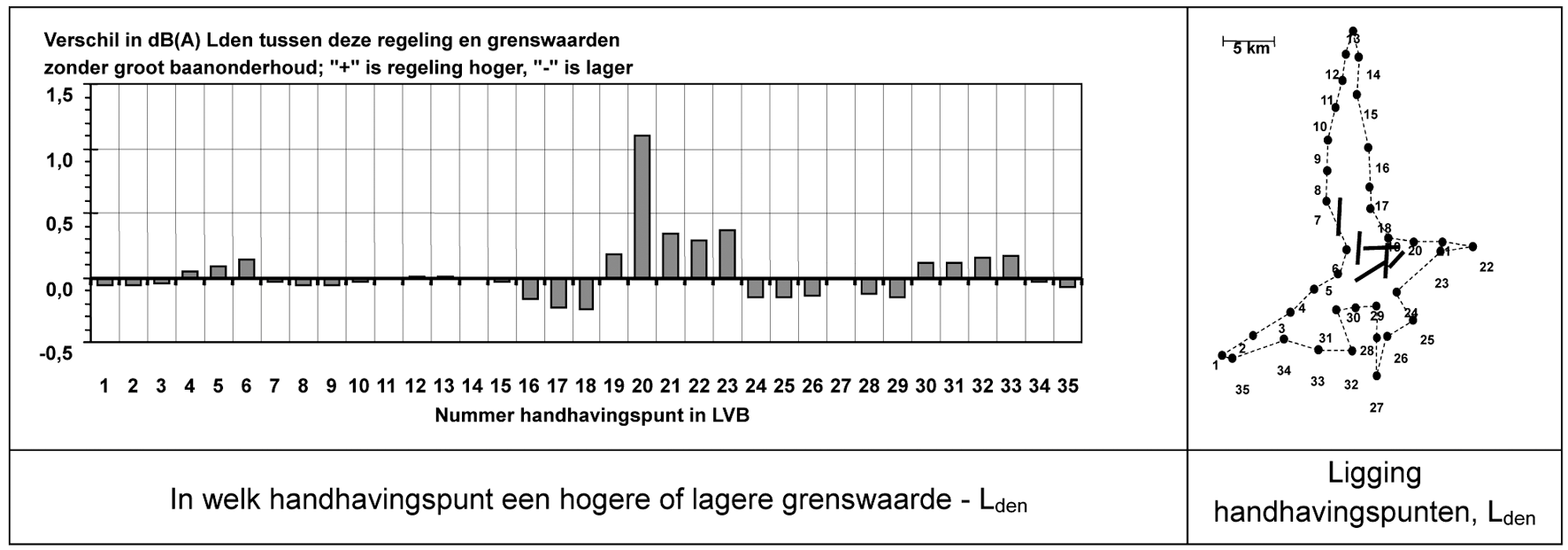 In de onderstaande figuur zijn de verschillen tussen de grenswaarden in de onderhavige regeling en de grenswaarden zonder groot baanonderhoud aangegeven. Een staafje boven de nullijn geeft aan met hoeveel dB(A) de grenswaarde is verhoogd ten behoeve van het onderhavige groot baanonderhoud, een staafje onder de nullijn geeft de verlaging aan.