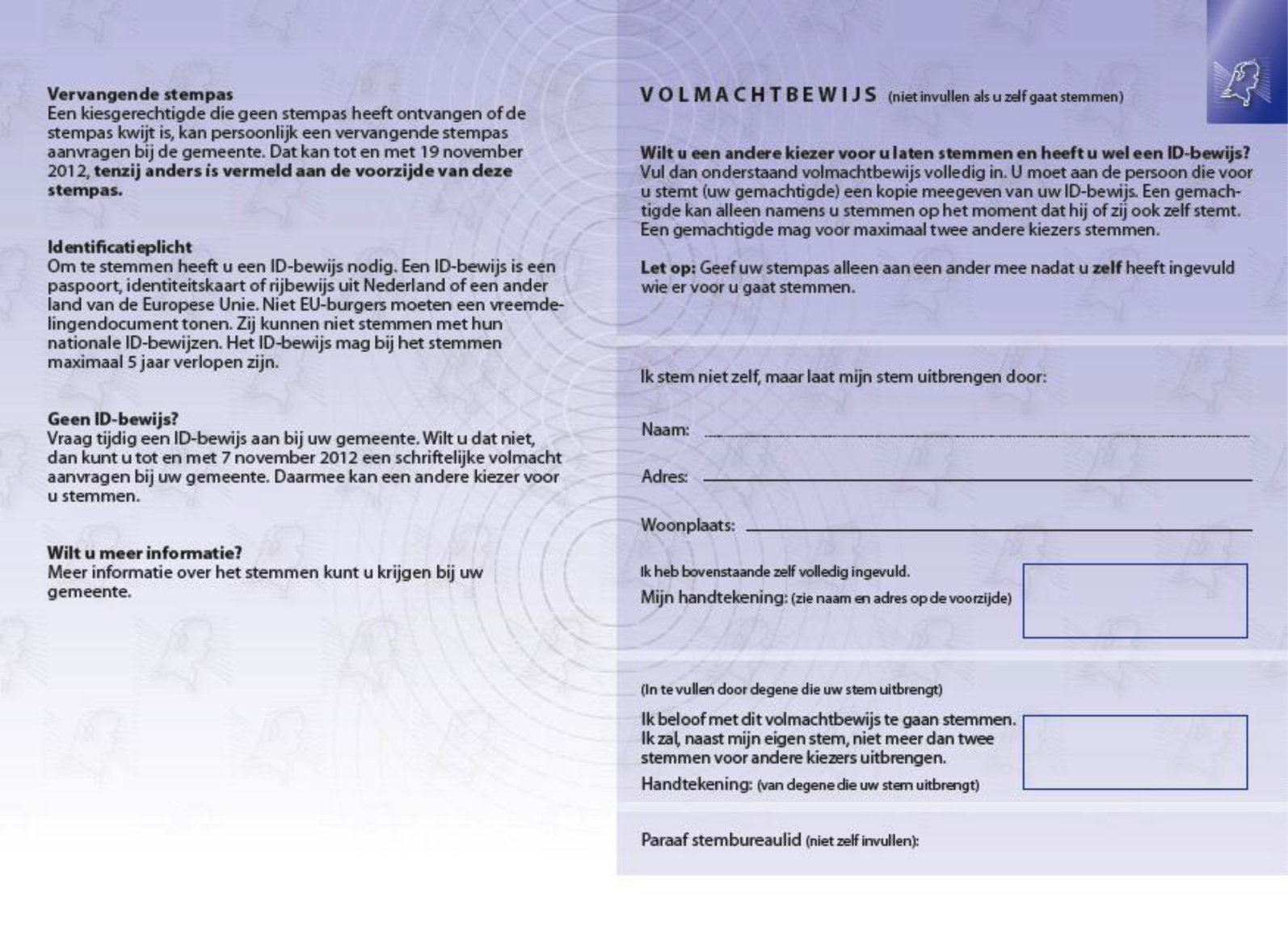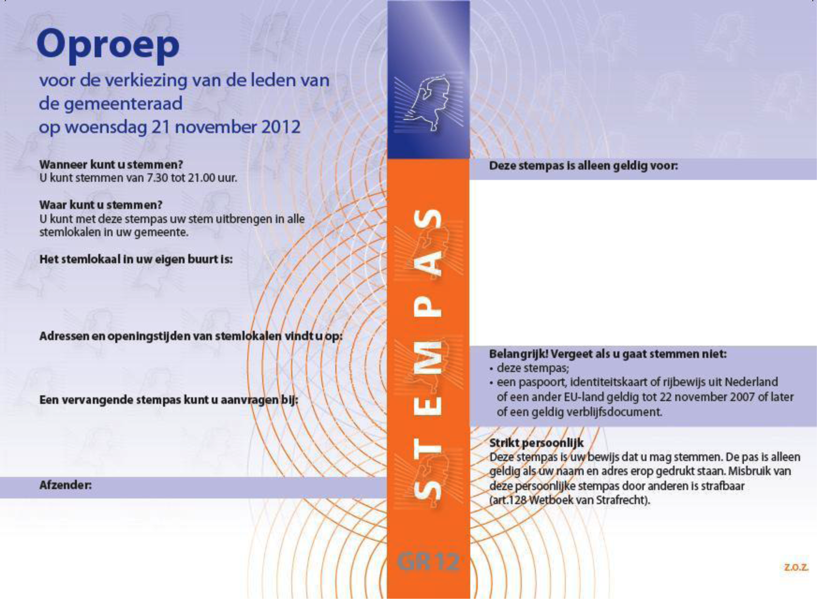 Voor de herindelingsverkiezingen van de leden van de gemeenteraden ‘Goeree-Overflakkee’, ‘Molenwaard’ en ‘Schagen’ op woensdag 21 november 2012 luidt de stempas als volgt: