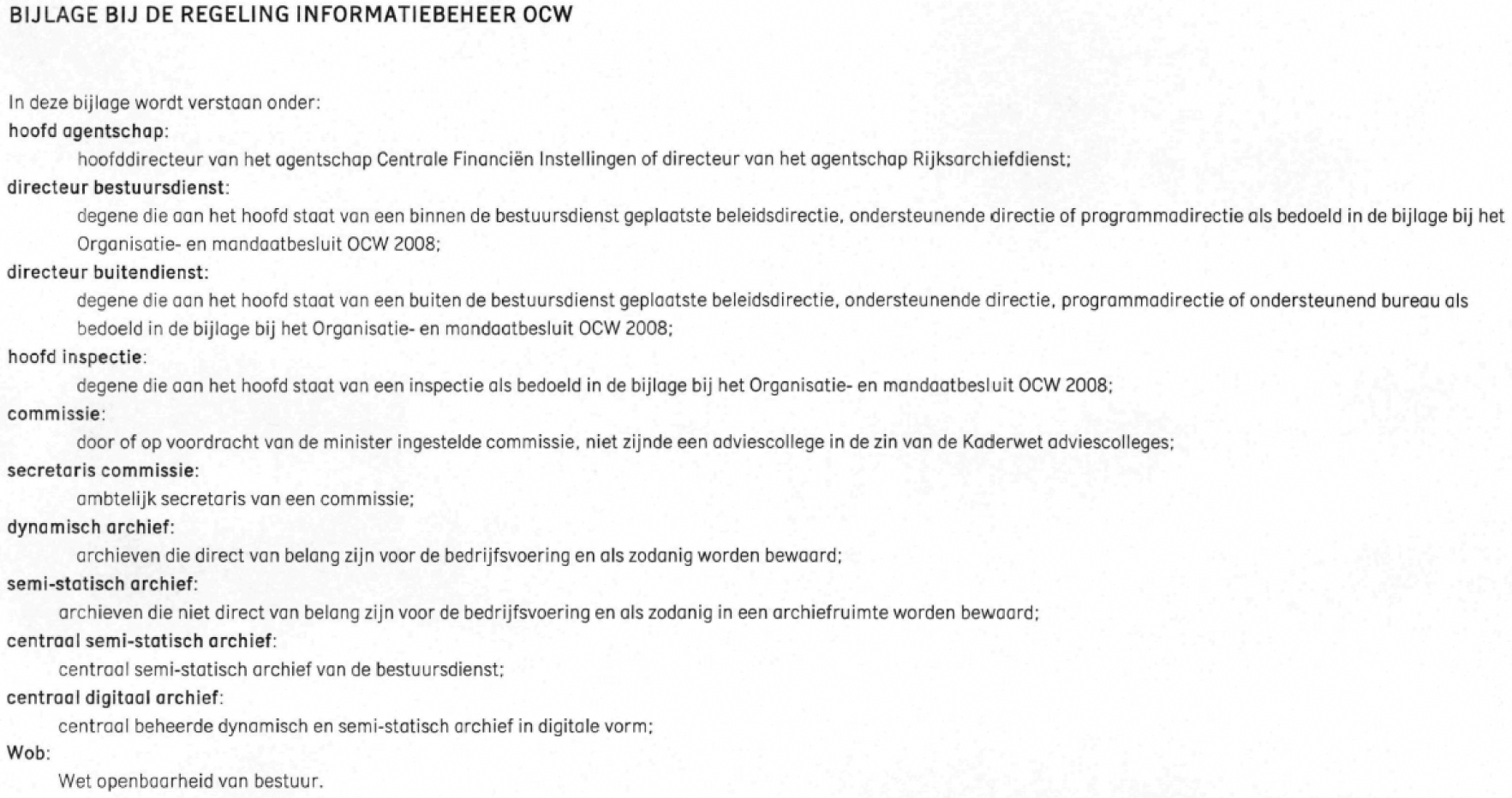 De minister van OCW heeft de verantwoordelijkheid voor de uitvoering van het beheer van de archiefbescheiden geregeld in de Regeling Informatiebeheer OCW 2009.