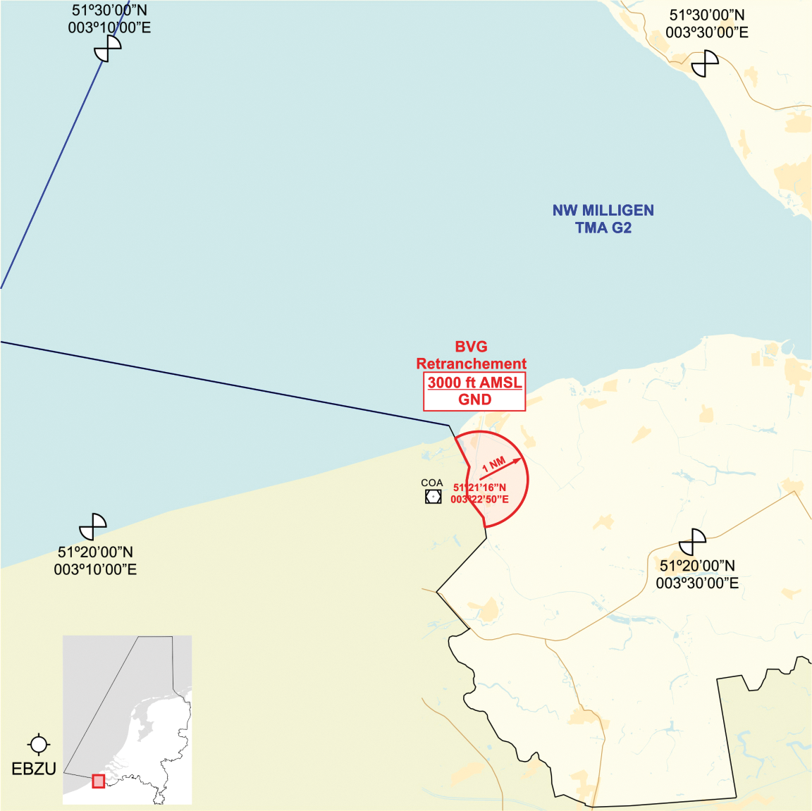 Ter bescherming van het luchtverkeer ten opzichte van bijzondere luchtverkeersactiviteiten tijdens de luchtvaartvertoning nabij Retranchement wordt als bijzonder luchtverkeersgebied (BVG) aangewezen het gebied ‘BVG Retranchement’ (zie figuur):