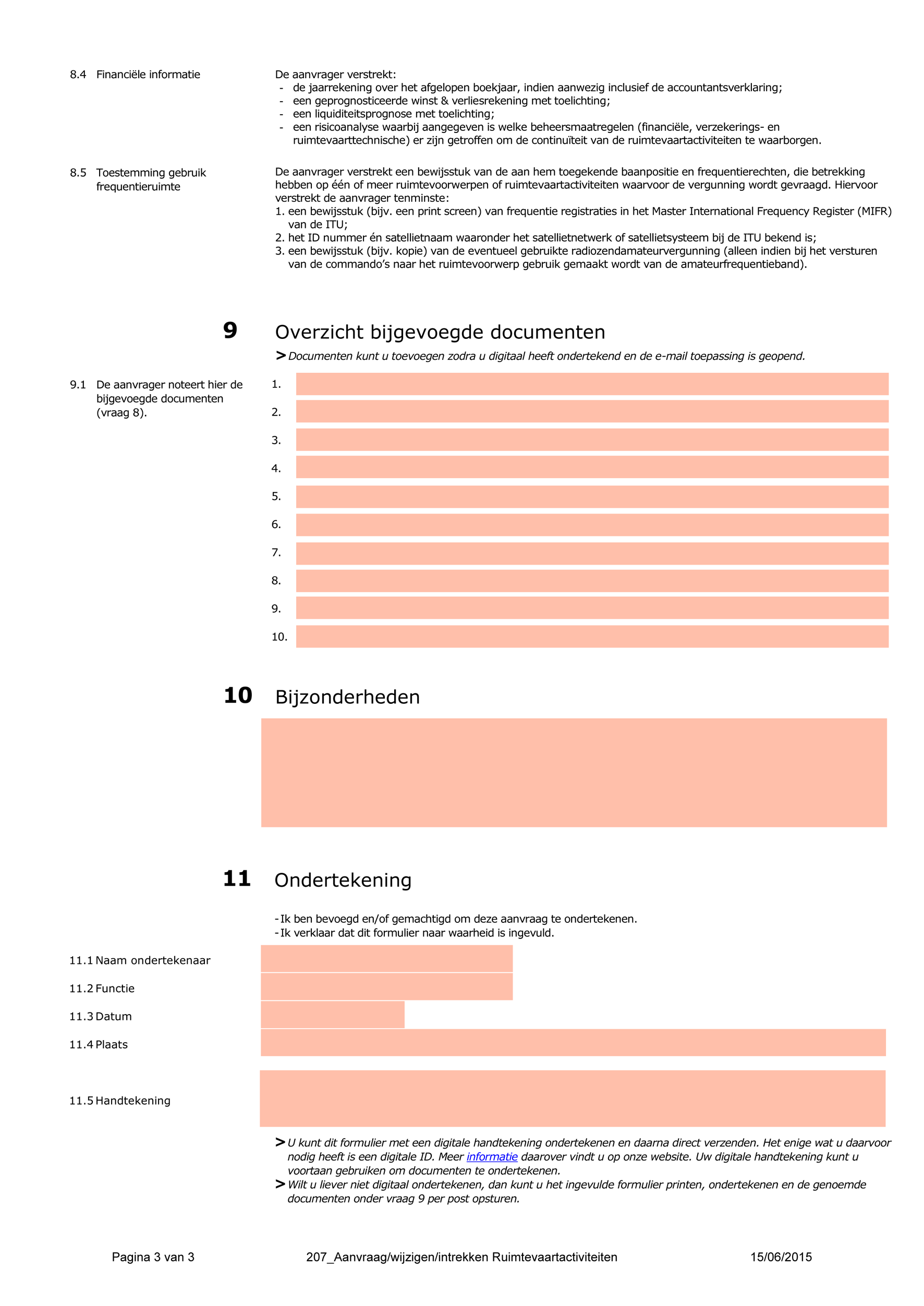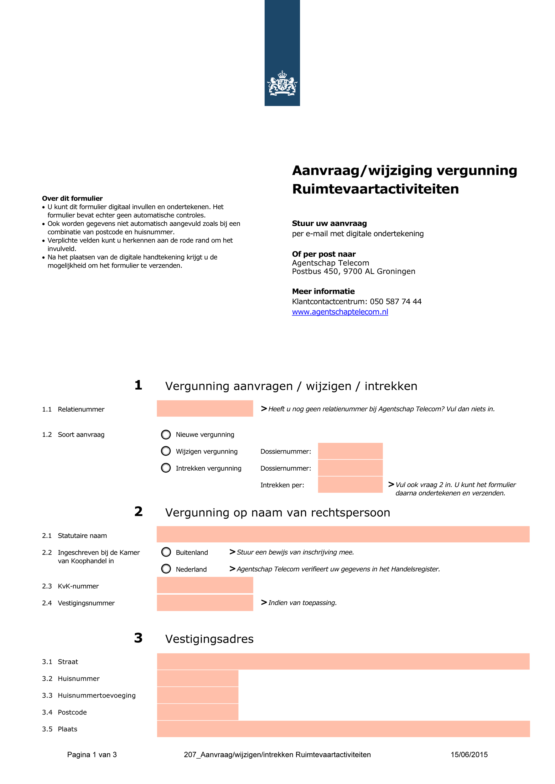 Een aanvraag tot verlening van een vergunning voor het verrichten van ruimtevaartactiviteiten geschiedt door middel van het indienen van een daartoe strekkend formulier zoals opgenomen in Bijlage I. De aanvrager dient zijn volledig ingevulde aanvraagformulier in bij Agentschap Telecom te Groningen onder overlegging van alle relevante documenten. Het aanvraagformulier wordt eenmalig ingevuld omdat de vergunning voor de duur van de ruimtevaartactiviteit wordt verleend en wordt ook gebruikt in geval van een verzoek tot wijziging van een verleende vergunning.