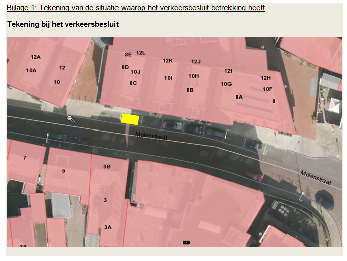 Dit houdt in dat één van de openbare parkeerplaatsen in de Molenstraat plaats zal maken voor een gereserveerde gehandicaptenparkeerplaats. De parkeerplaats is op de tekening hierboven met een geelvlak aangegeven.