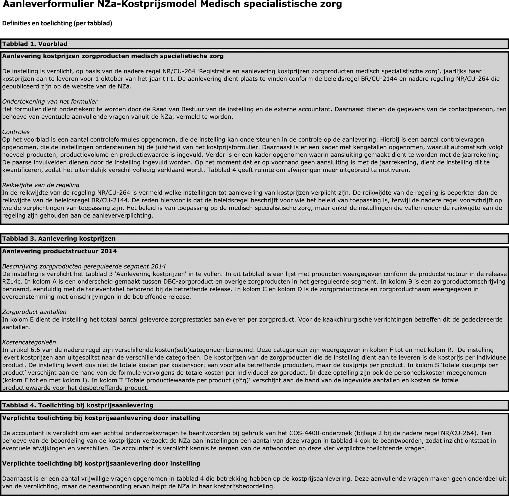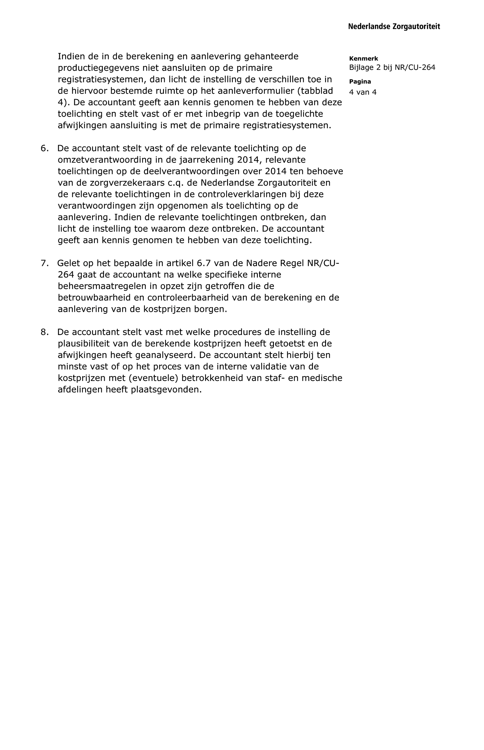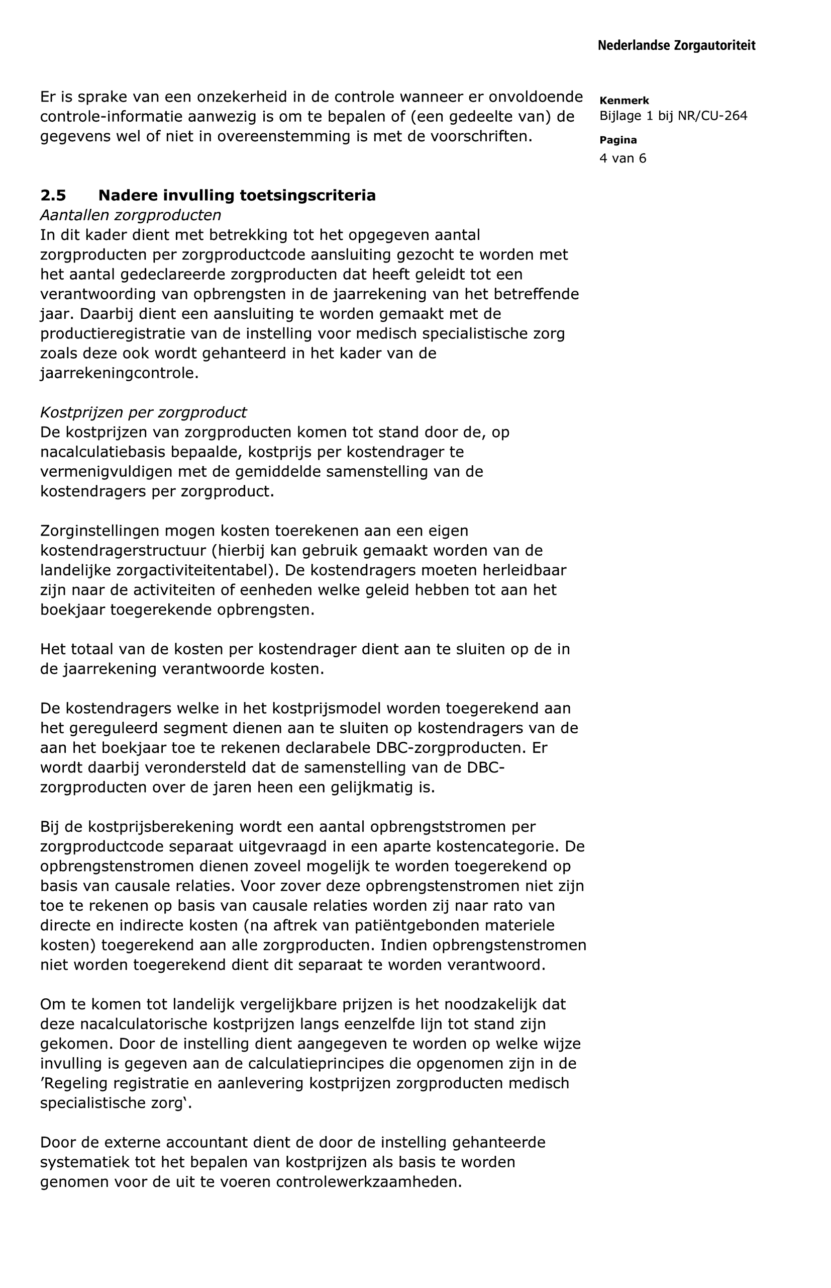 4.1 De instelling draagt er zorg voor dat documentatie over de uitvoering van de berekening en over de gemaakte onderliggende keuzes beschikbaar en controleerbaar is voor zowel de accountant als de NZa gedurende een periode van twee jaar gerekend vanaf de datum van aanlevering van de gegevens aan de NZa, een en ander op de wijze als beschreven in artikel 6.