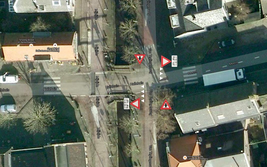 door middel van het plaatsen van de verkeersborden B3 van bijlage 1 van het RVV 1990 op de Van Teylingenweg, aan weerszijden van het kruispunt met de Meent en de verkeersborden B6 van bijlage 1 van het RVV 1990, voorzien van onderborden “(brom)fietsers in twee richtingen” met de bijbehorende haaientanden op de Meent, aan weerszijden van het kruispunt met de Van Teylingenweg, een voorrangskruispunt in te stellen op het kruispunt Meent – Van Teylingenweg, waardoor bestuurders op de Meent voorrang moeten verlenen aan bestuurders op de Van Teylingenweg;