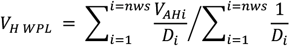 2. De verticaal geëxtrapoleerde windsnelheden worden horizontaal geïnterpoleerd naar de locatie van het betreffende windpark. Daarbij worden de geëxtrapoleerde windsnelheden gewogen naar de afstanden tussen de meetstations en de locatie van het platform van het net op zee waarop het betreffende windpark is aangesloten, volgens de onderstaande formule:
