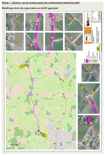 De organisatie zal voor het evenement waarschuwingsborden plaatsen zoals op tekening aangegeven. Verder zal op de wedstrijddag de overige bebording zoals afzethekken met C1 en afzethekken met borden doorgaand rijverkeer gestremd worden geplaatst op donderdag 5 mei en vrijdag 6 mei 2016.