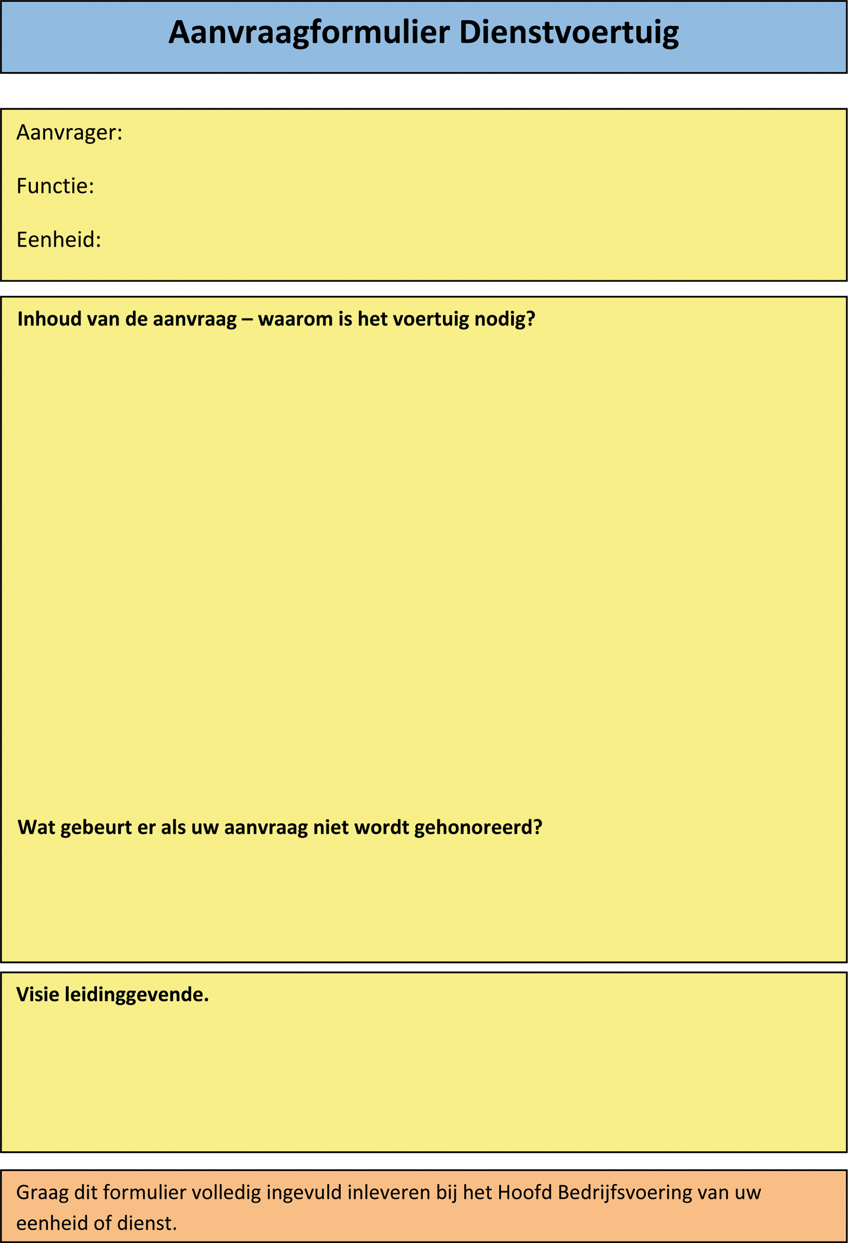 verstrekken van een permanente dienstauto de meest wenselijke situatie is, dan wordt het verzoek voor een dienstauto door de leidinggevende van de aanvrager doorgeleid naar het Hoofd Bedrijfsvoering van de eenheid of dienst. Dit betreffen individuele aanvragen, wat inhoudt dat er niet één aanvraag kan worden ingediend voor een groep medewerkers tegelijk. Het Hoofd Bedrijfsvoering maakt een eerste beoordeling van de aanvragen op basis van een volledig ingevuld aanvraagformulier. Deze toetst met name de operationele noodzaak van aanvragen uit zijn of haar eenheid.