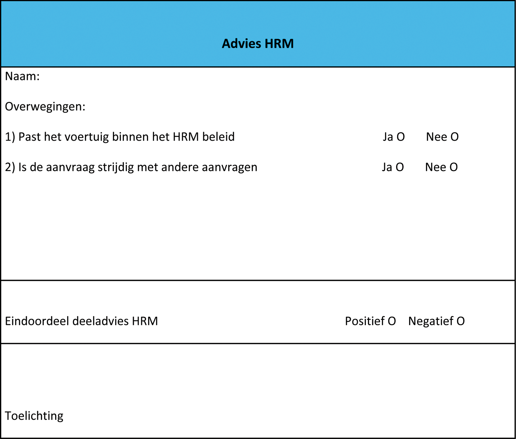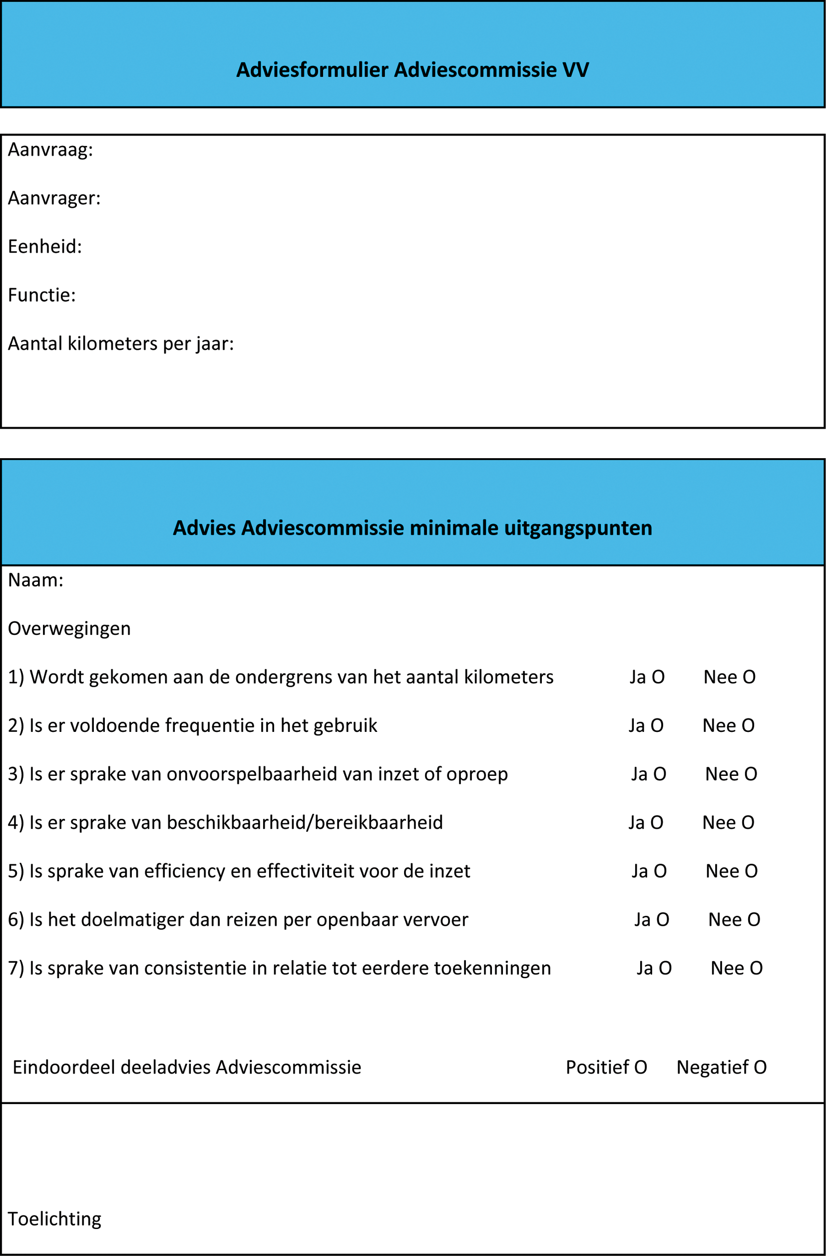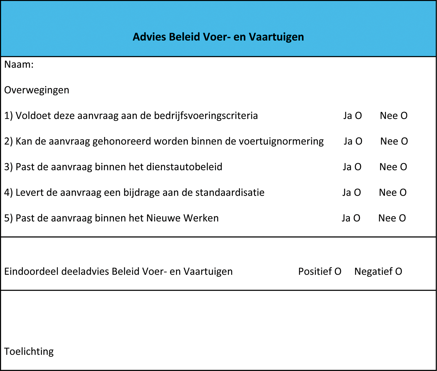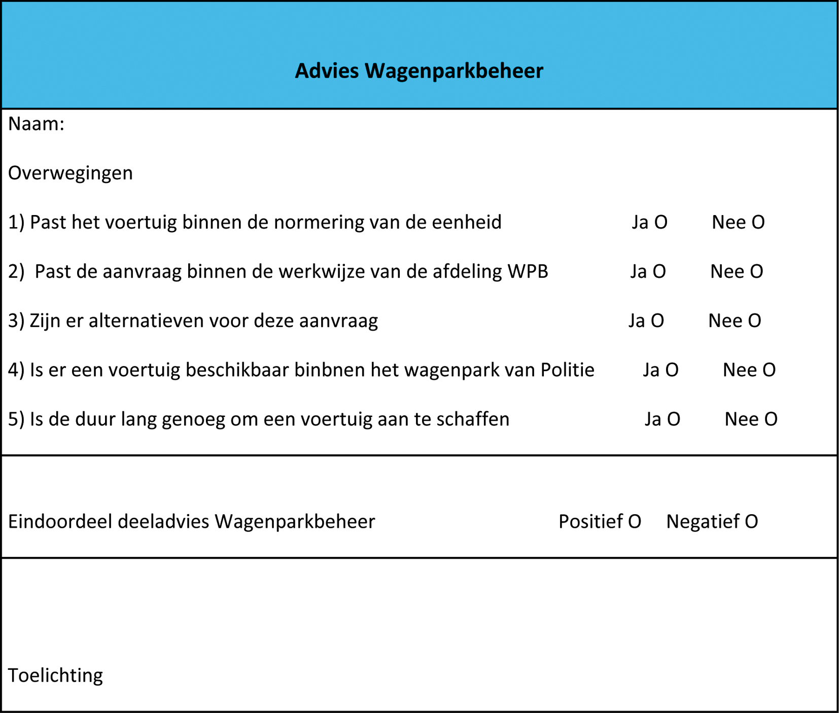 In dit adviesformulier staat de zienswijze van de adviescommissie op de voordracht tot het permanent ter beschikking stelling van een dienstauto, gebaseerd op doelmatigheid, volledigheid, doeltreffendheid en prioritering, inclusief een financiële onderbouwing. Tevens staat vermeld, op welke termijn en onder welke voorwaarden de voordracht uitgevoerd zou kunnen worden en op welke wijze invulling wordt gegeven aan de voordracht.