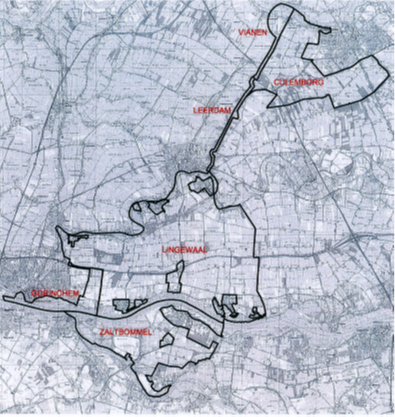 De planbegrenzing van het gecoördineerde bestemmingsplan voor de borging van de Nieuwe Hollandse Waterlinie ligt binnen het grondgebied van zes gemeenten die onderdeel uitmaken van het 'Pact van Loevestein', namelijk Vianen, Culemborg, Leerdam, Lingewaal, Gorinchem en Zaltbommel.