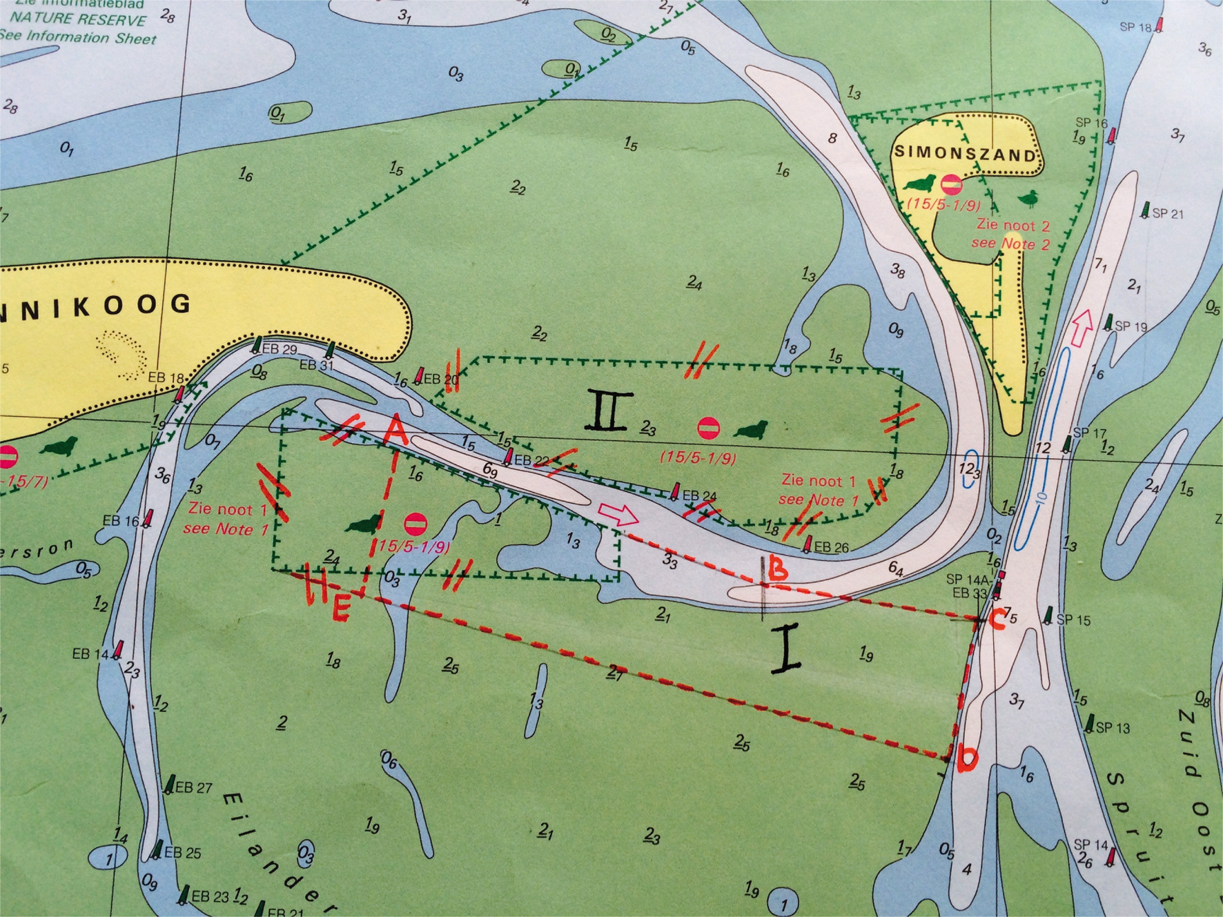 A. Het ten noorden van de vaargeul tussen de boeien EB 29 en EB 26 gelegen deel van het gebied komt te vervallen.