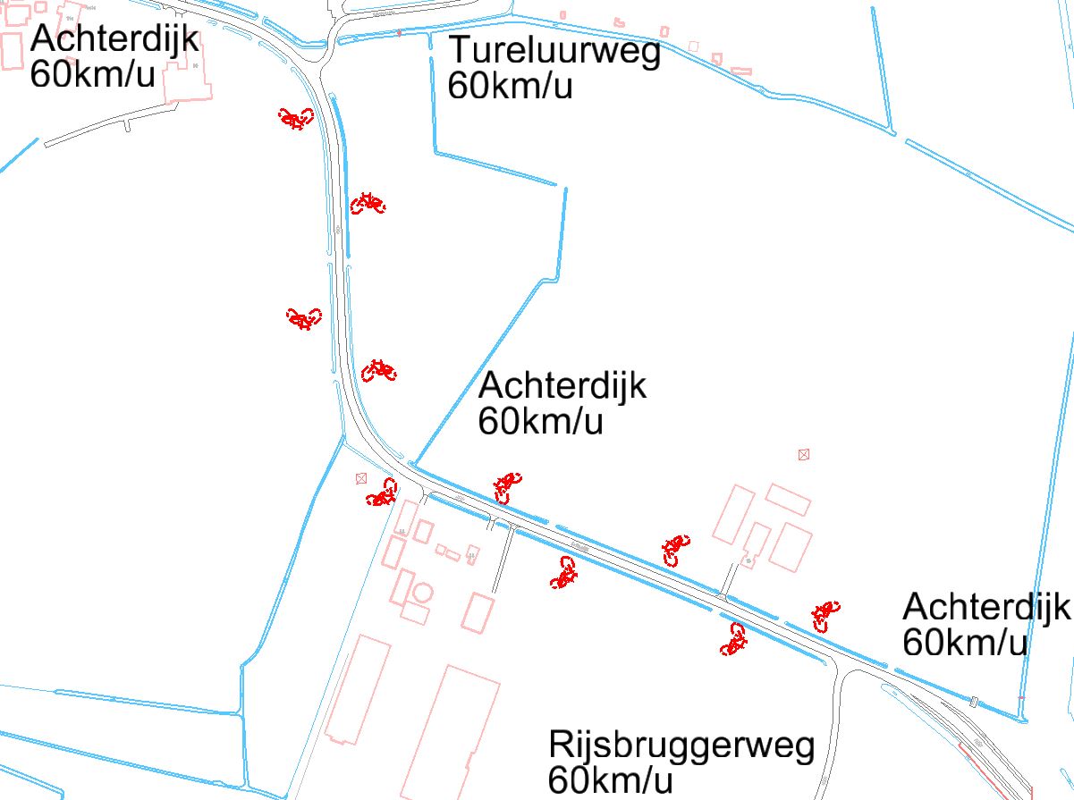 In de afbeelding hierboven wordt met rode cirkels de kruispunten aangegeven, welke gelijkwaardig worden. De snelfietsroute op de Achterdijk is aangeduid met rode fietssymbolen.