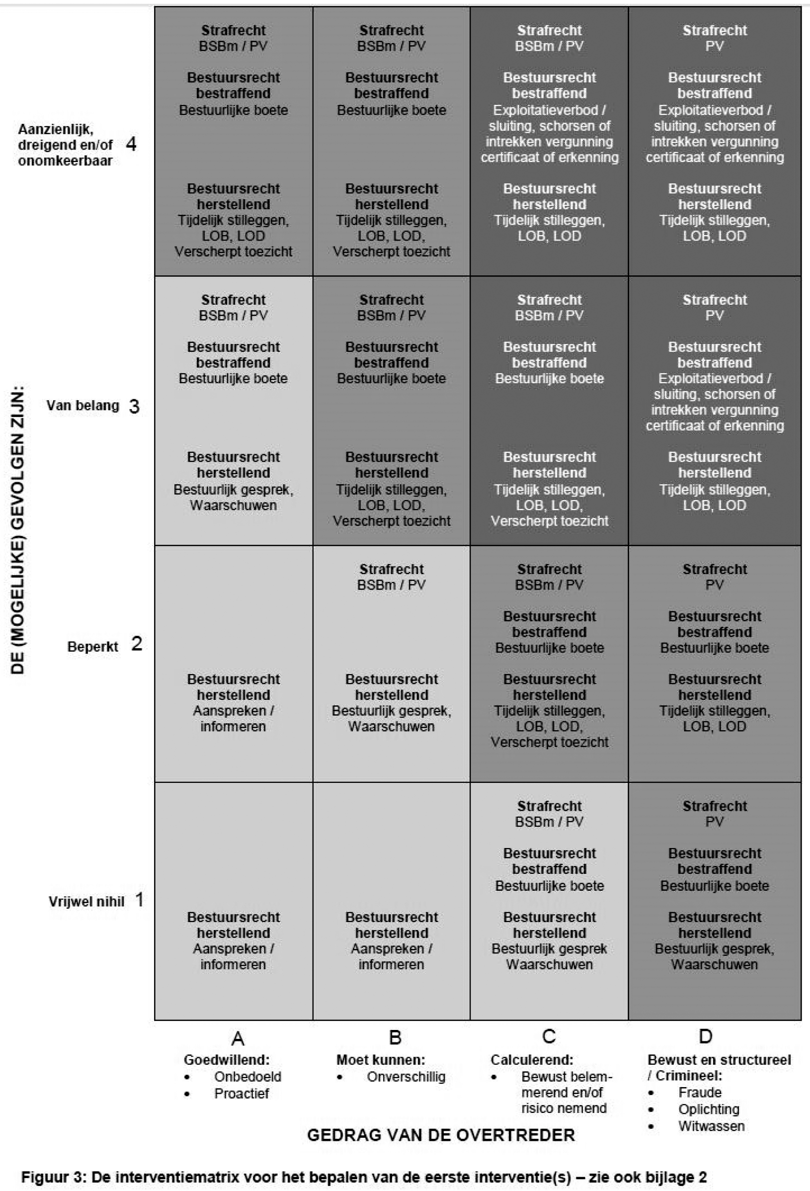 De handhaver bepaalt ten eerste in welk segment van de in figuur 2 opgenomen interventiematrix hij de bevinding positioneert12 door: (1) het beoordelen van de gevolgen van de bevinding voor milieu, natuur, water, veiligheid, gezondheid en/of maatschappelijke relevantie en (2) het typeren van de normadressaat.