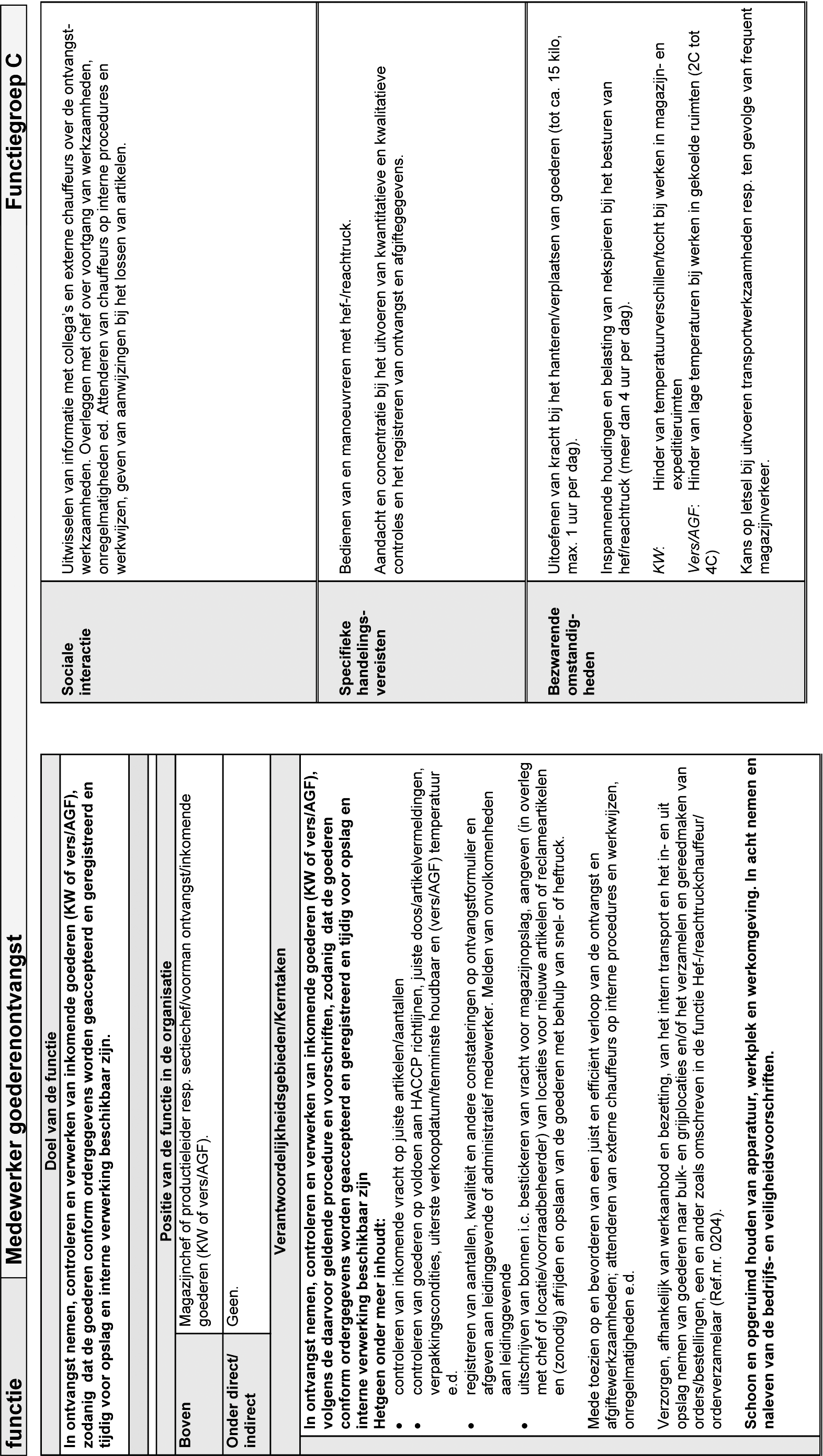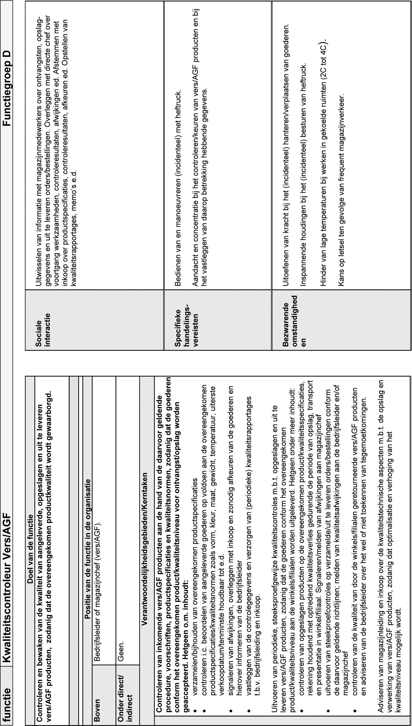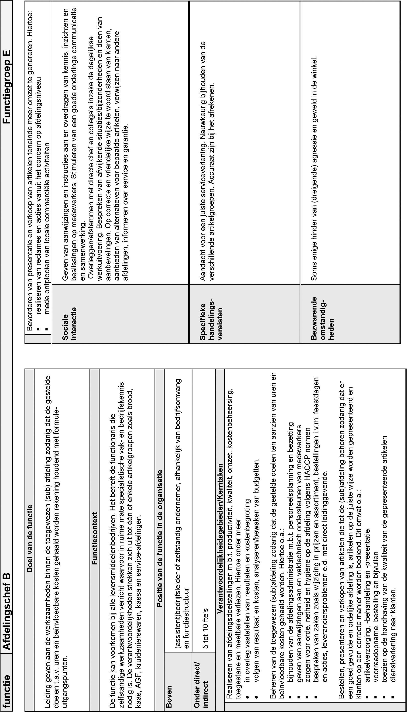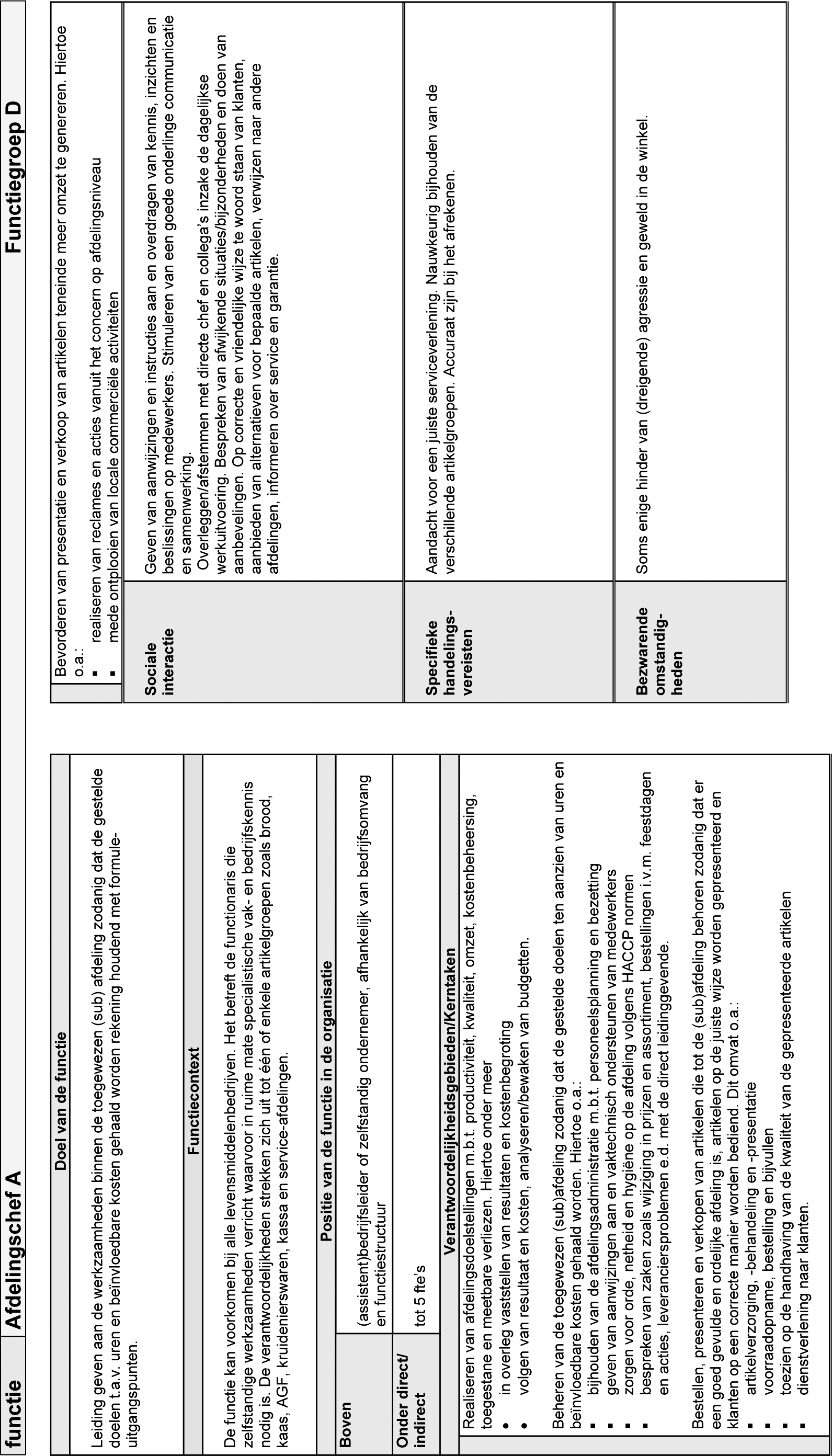 Op de functiedocumenten staat onder het kopje ‘positie van de functie in de organisatie’ bij onder direct/indirect of er in de functie sprake is van leidinggeven. Bij de functies Afdelingschef en (Assistent) Bedrijfsleider betreft dit direct/hiërarchisch leidinggeven, waarbij de desbetreffende functionaris verantwoordelijk is voor alle door de onder hem/haar gestelde medewerkers uit te voeren werkzaamheden, in kwalitatieve en kwantitatieve zin. Hij/zij beoordeelt de medewerkers in hun werk, neemt waarnodig corrigerende maatregelen en is (mede) betrokken bij aanname en ontslag.