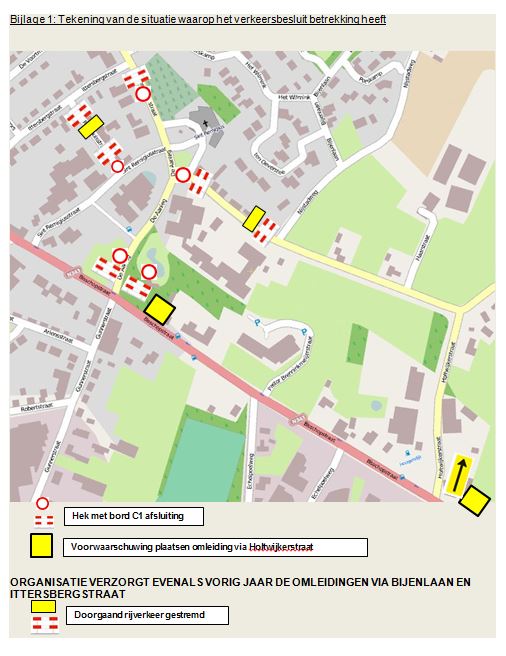 De overige omleidingen worden evenals vorig jaar door de organisatie verzorgd (Bijenlaan / Ittersbergstraat)