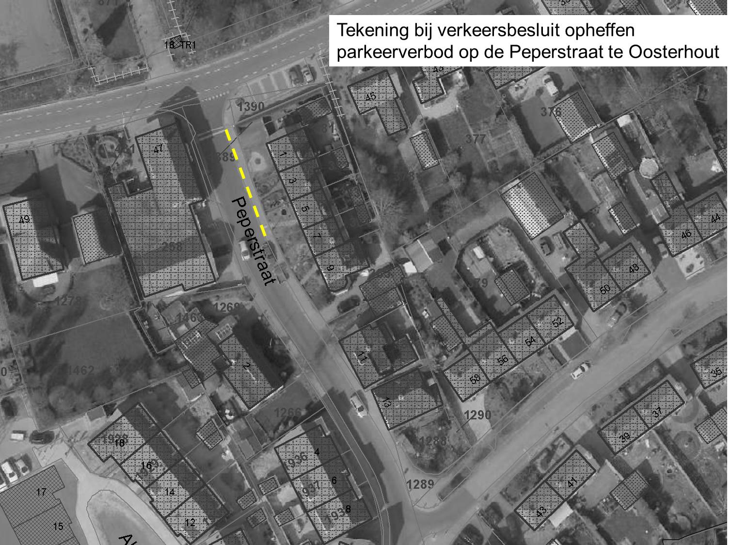 door het verwijderen van gele onderbroken markering, zoals bedoeld in Hoofdstuk IV, paragraaf 2, onderdeel 2 van de ‘Uitvoeringsvoorschriften BABW inzake verkeerstekens’, het parkeerverbod aan de oostzijde van de Peperstraat te Oosterhout vanaf de Oosterhoutsestraat tot en met huisnummer 5 op te heffen;