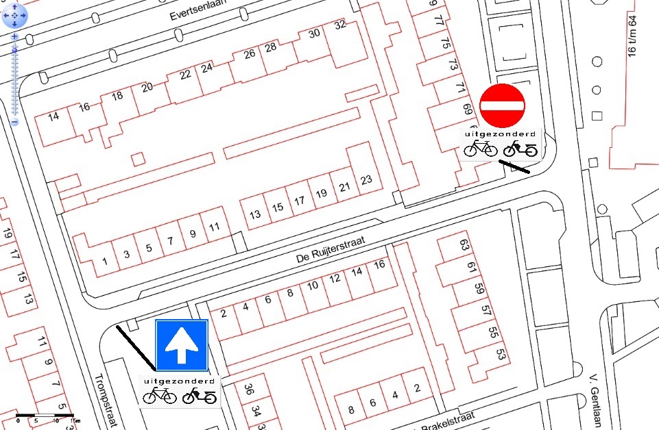 - dat de De Ruijterstraat in twee richtingen wordt bereden;