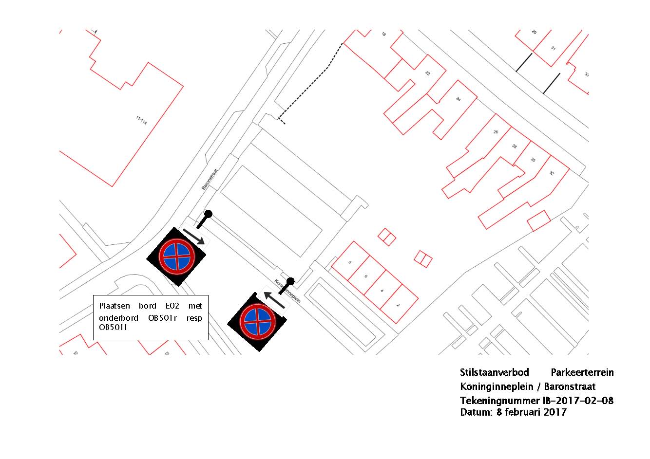 door middel van het plaatsen van de borden model E02, als bedoeld in Bijlage 1 van het RVV 1990, een stilstaanverbod in te voeren op een deel van het parkeerterrein aan de Baronstraat ter plaatse van het Koninginneplein;