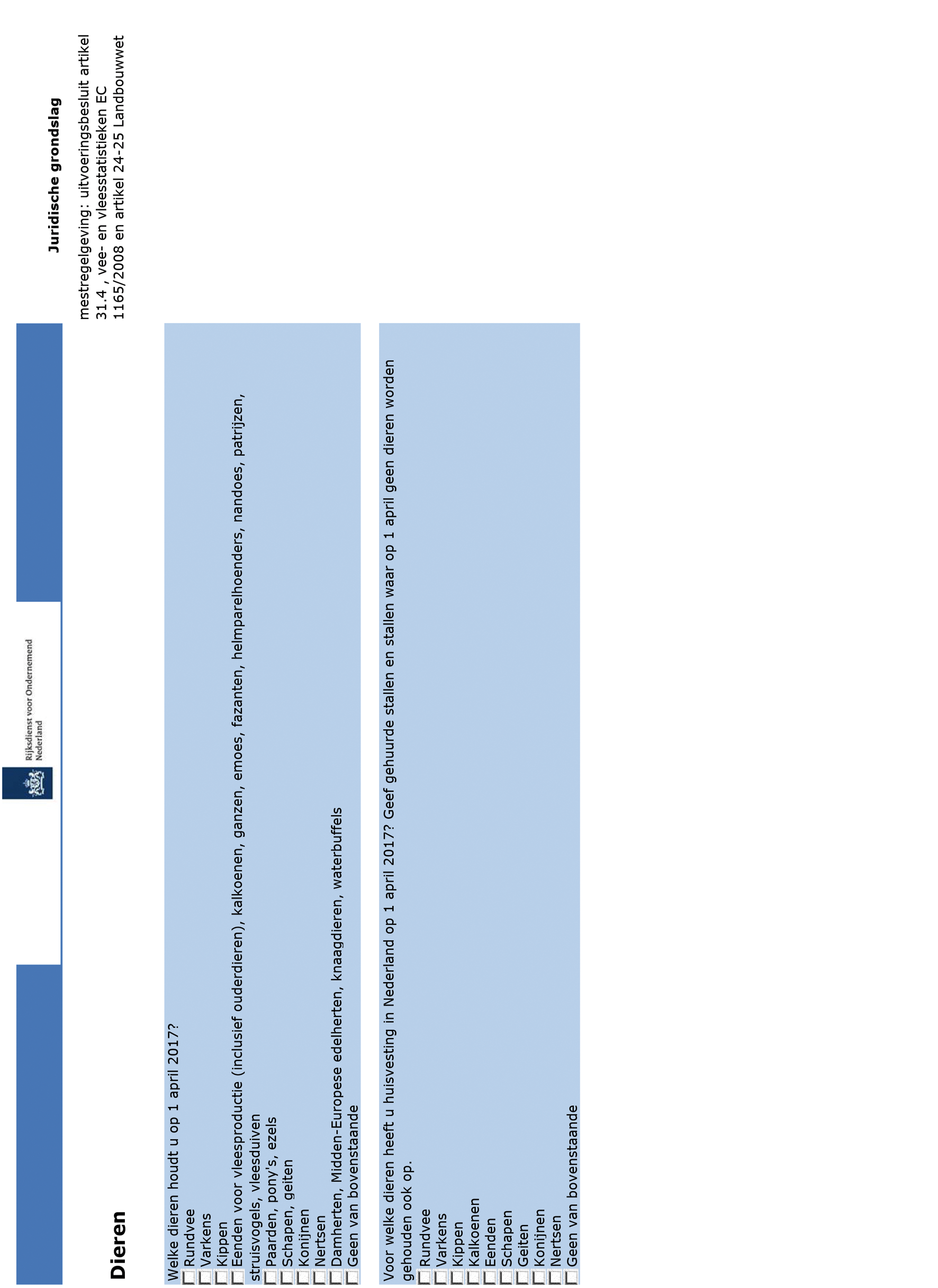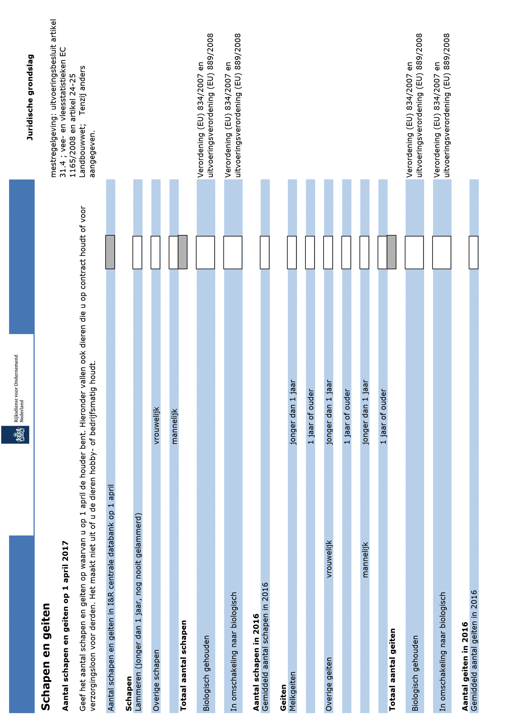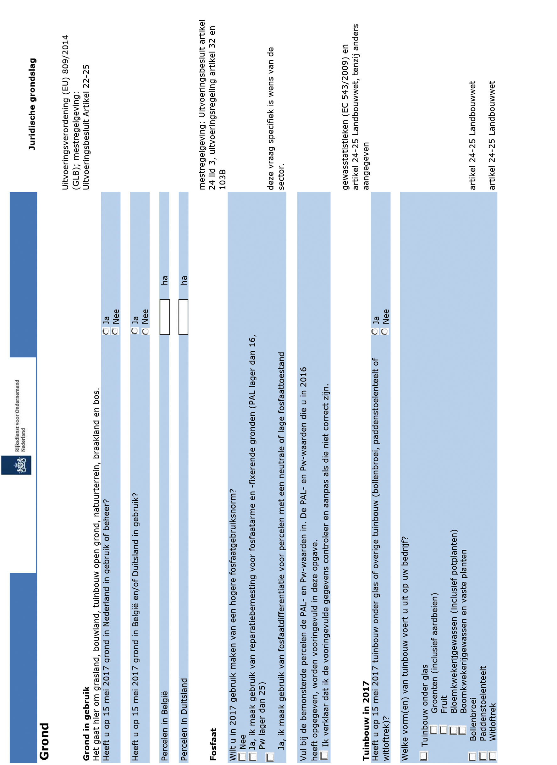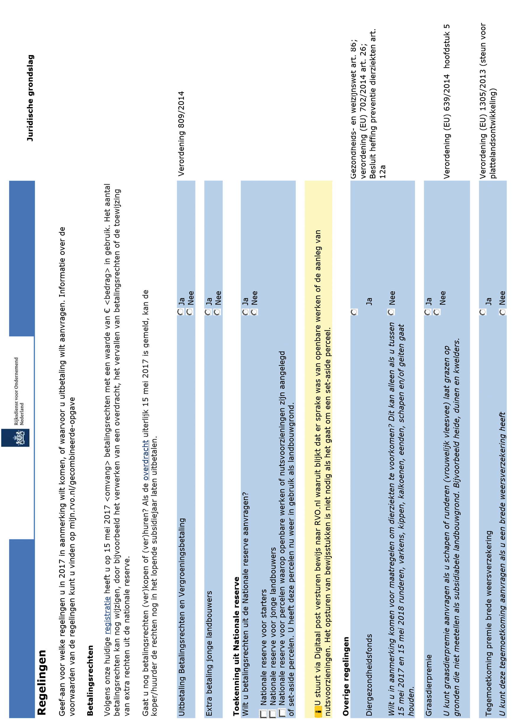 De bij deze regeling gepubliceerde vraagstelling vormt de grondslag om in 2017 gecombineerd de opgave te doen voor de landbouwtelling op grond van de Landbouwwet, de opgave gebruik gewaspercelen op grond van het Uitvoeringsbesluit Meststoffenwet, de verzamelaanvraag op grond van de Uitvoeringsregeling rechtstreekse betalingen GLB, de aangifte van de CO2-jaarvracht van glastuinbouwbedrijven op grond van de Wet milieubeheer, de opgave voor aanspraak op betalingen uit het Diergezondheidsfonds op grond van de Gezondheids- en welzijnswet en voor het verstrekken van informatie of een betaalverzoek in het kader van twee steunregelingen die onderdeel zijn van het plattelandsontwikkelingsprogramma.