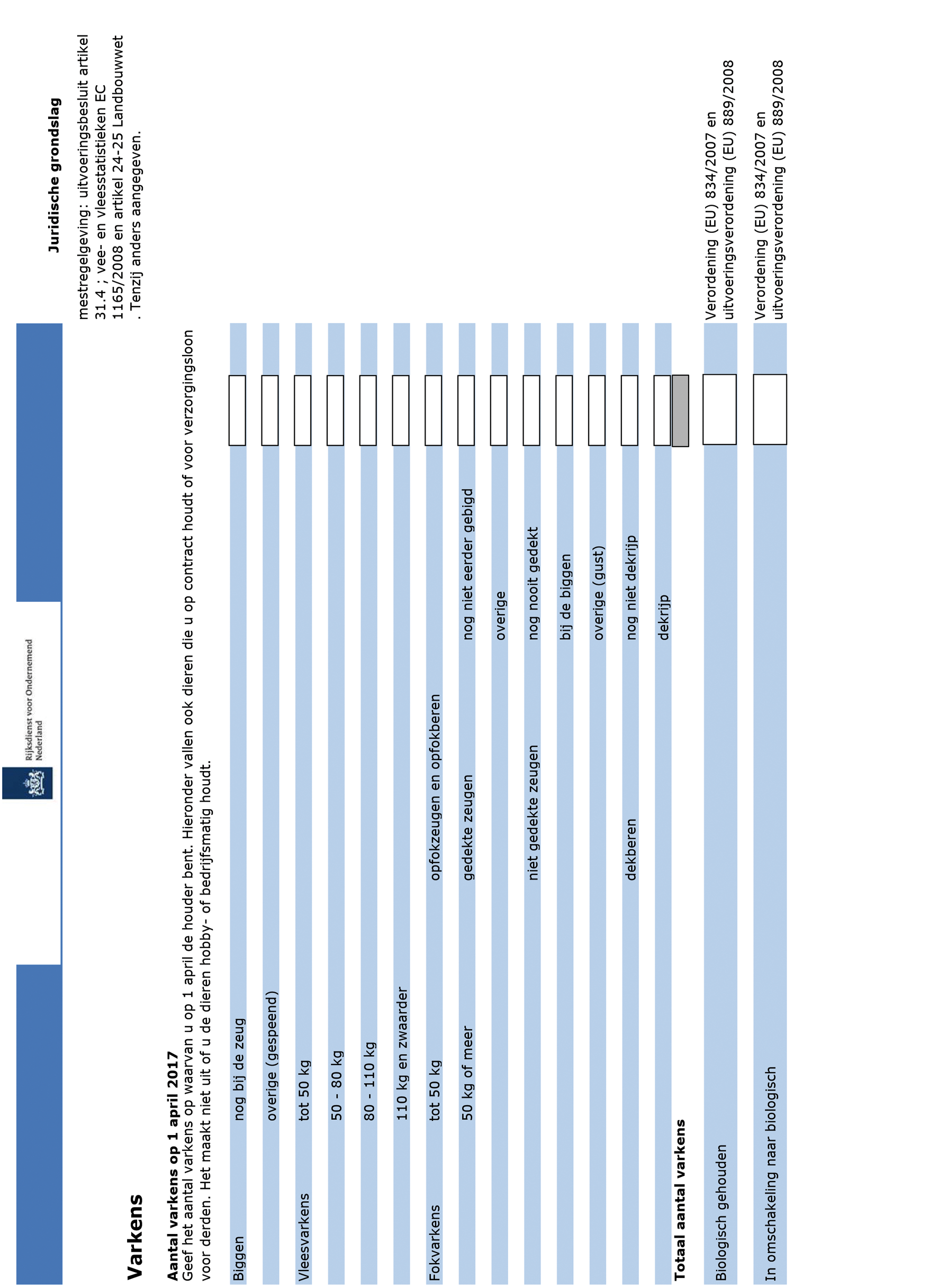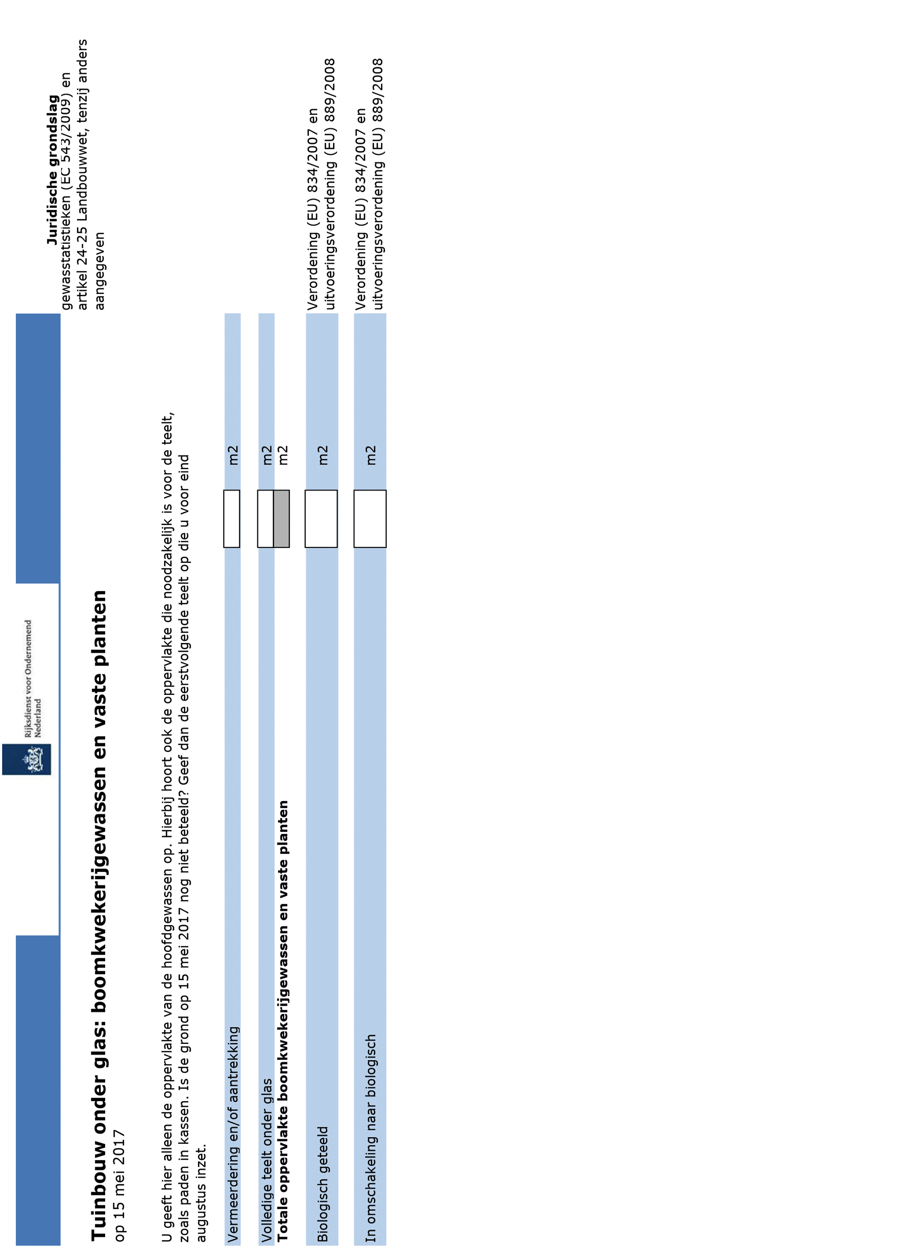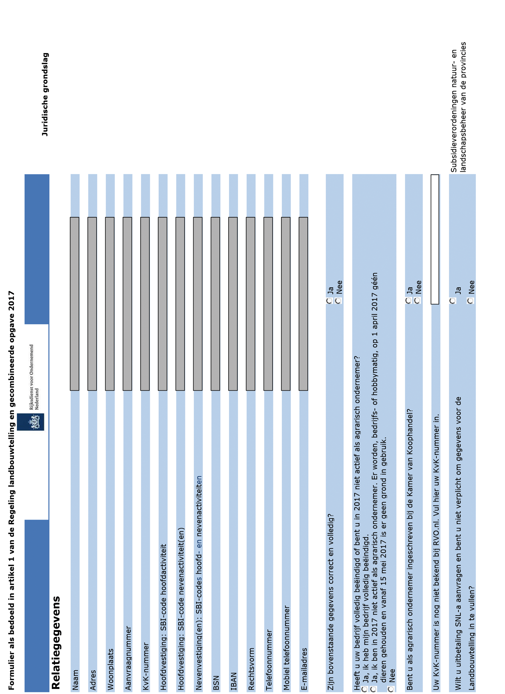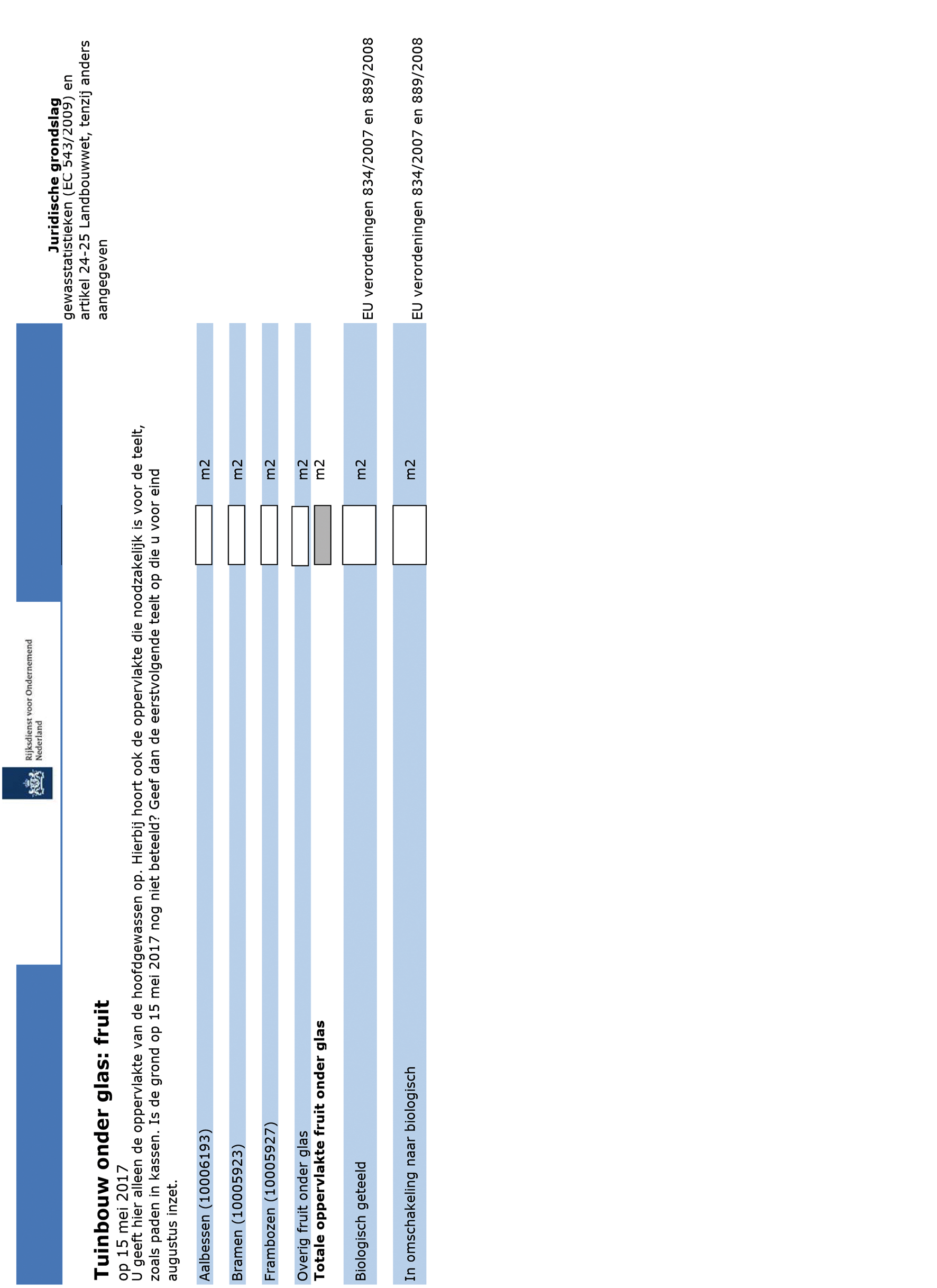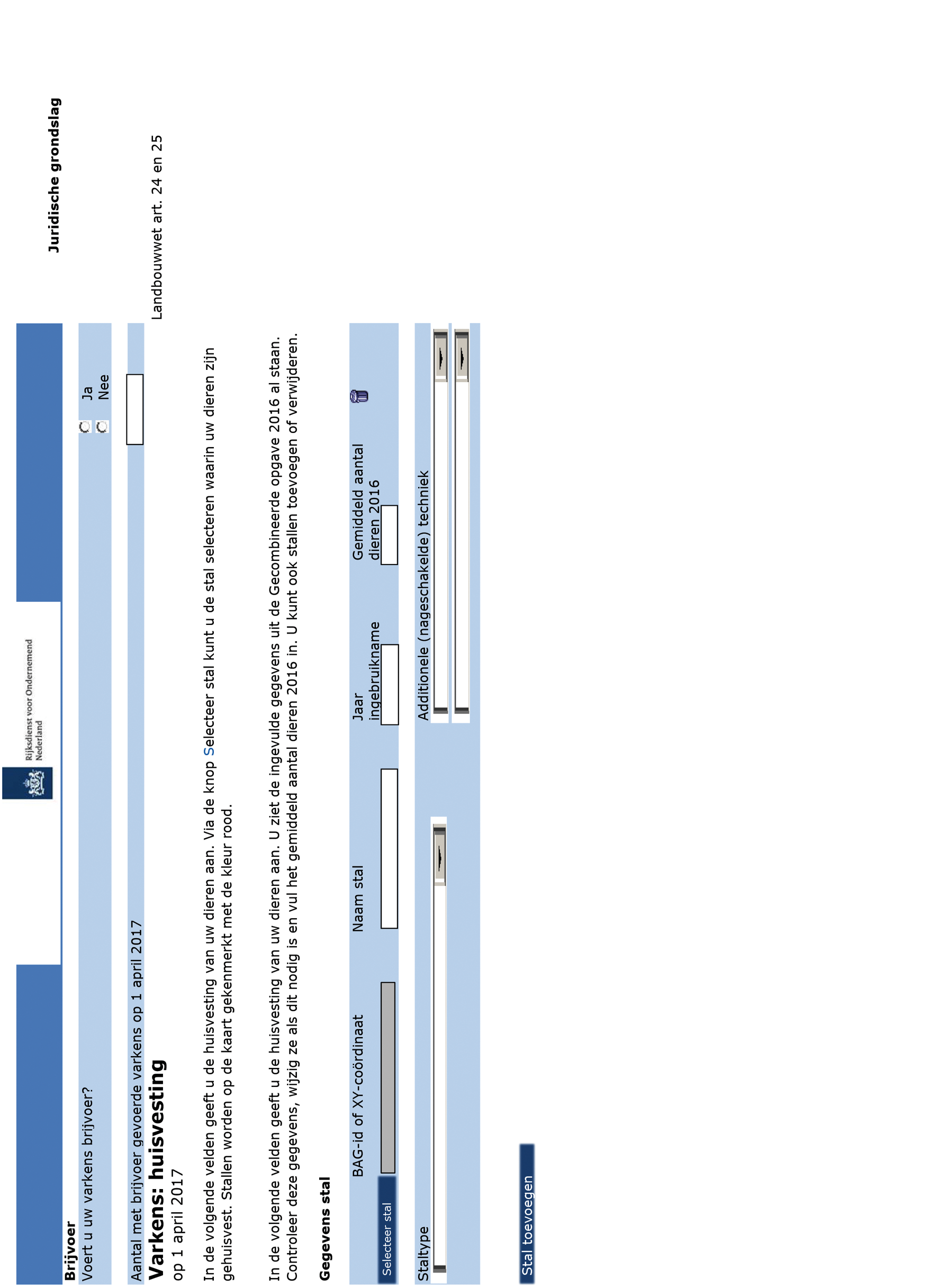 De bij deze regeling gepubliceerde vraagstelling vormt de grondslag om in 2017 gecombineerd de opgave te doen voor de landbouwtelling op grond van de Landbouwwet, de opgave gebruik gewaspercelen op grond van het Uitvoeringsbesluit Meststoffenwet, de verzamelaanvraag op grond van de Uitvoeringsregeling rechtstreekse betalingen GLB, de aangifte van de CO2-jaarvracht van glastuinbouwbedrijven op grond van de Wet milieubeheer, de opgave voor aanspraak op betalingen uit het Diergezondheidsfonds op grond van de Gezondheids- en welzijnswet en voor het verstrekken van informatie of een betaalverzoek in het kader van twee steunregelingen die onderdeel zijn van het plattelandsontwikkelingsprogramma.