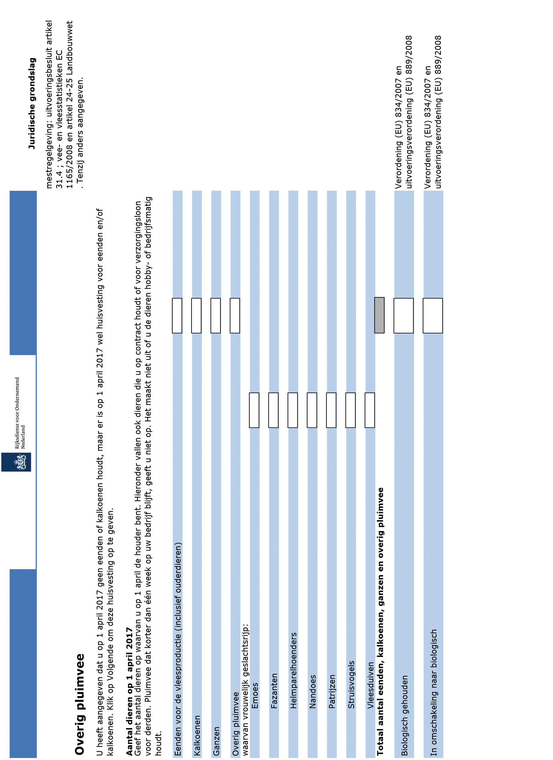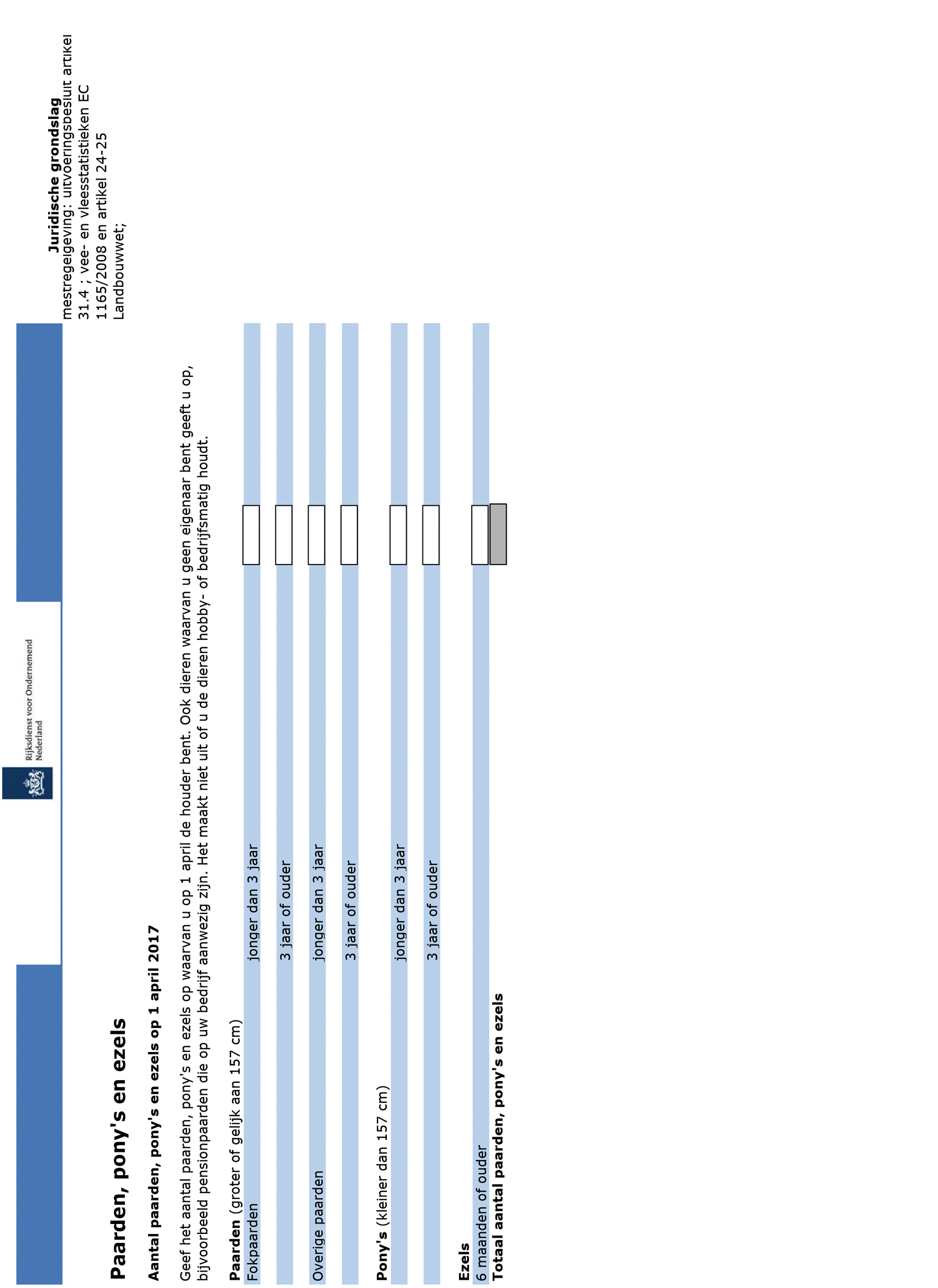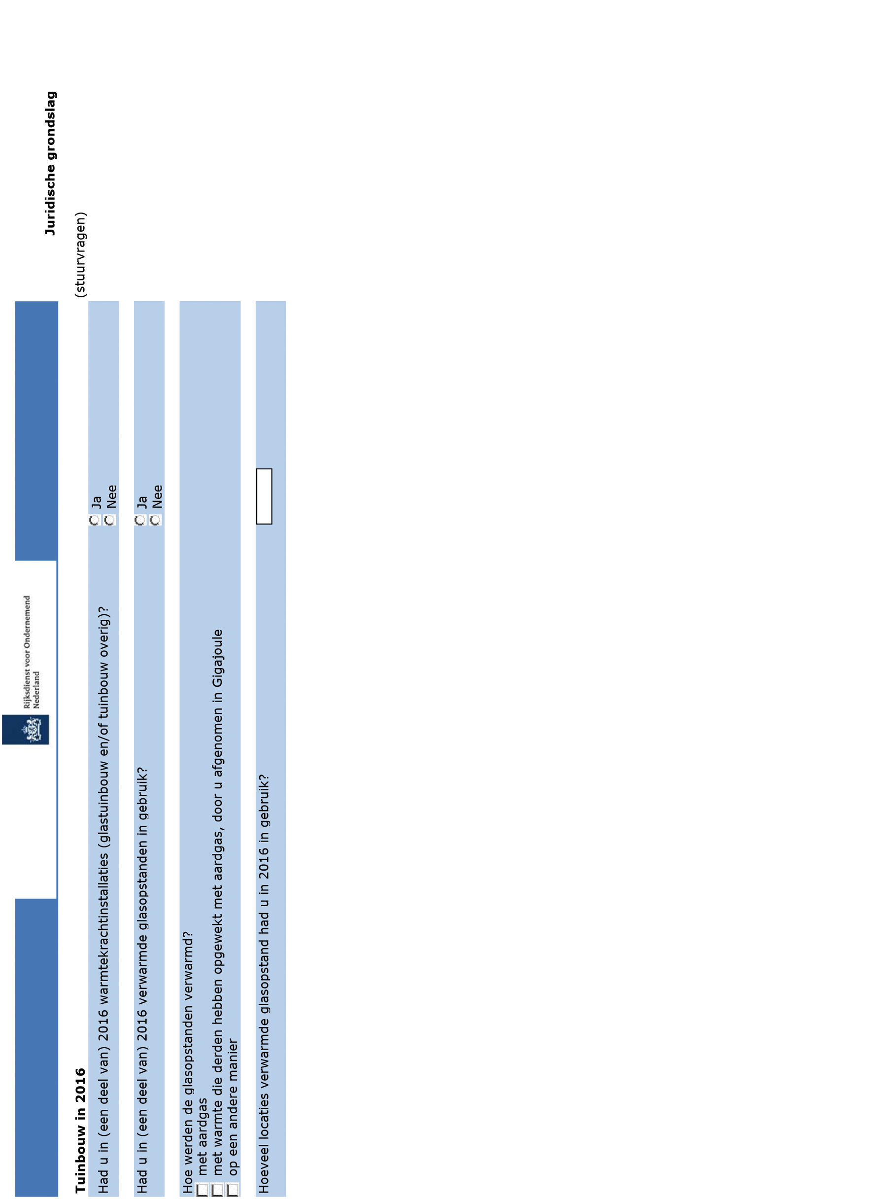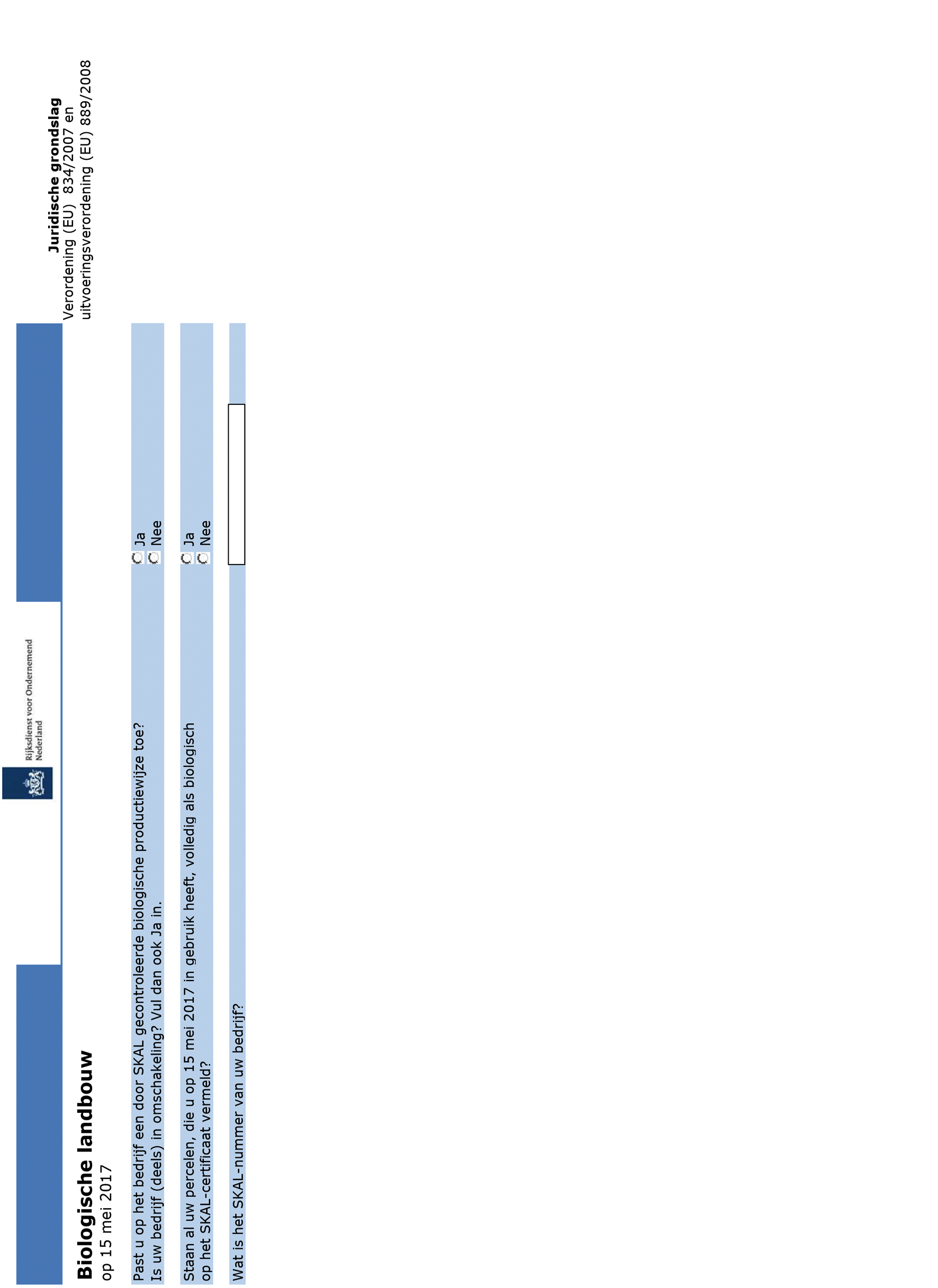 De bij deze regeling gepubliceerde vraagstelling vormt de grondslag om in 2017 gecombineerd de opgave te doen voor de landbouwtelling op grond van de Landbouwwet, de opgave gebruik gewaspercelen op grond van het Uitvoeringsbesluit Meststoffenwet, de verzamelaanvraag op grond van de Uitvoeringsregeling rechtstreekse betalingen GLB, de aangifte van de CO2-jaarvracht van glastuinbouwbedrijven op grond van de Wet milieubeheer, de opgave voor aanspraak op betalingen uit het Diergezondheidsfonds op grond van de Gezondheids- en welzijnswet en voor het verstrekken van informatie of een betaalverzoek in het kader van twee steunregelingen die onderdeel zijn van het plattelandsontwikkelingsprogramma.