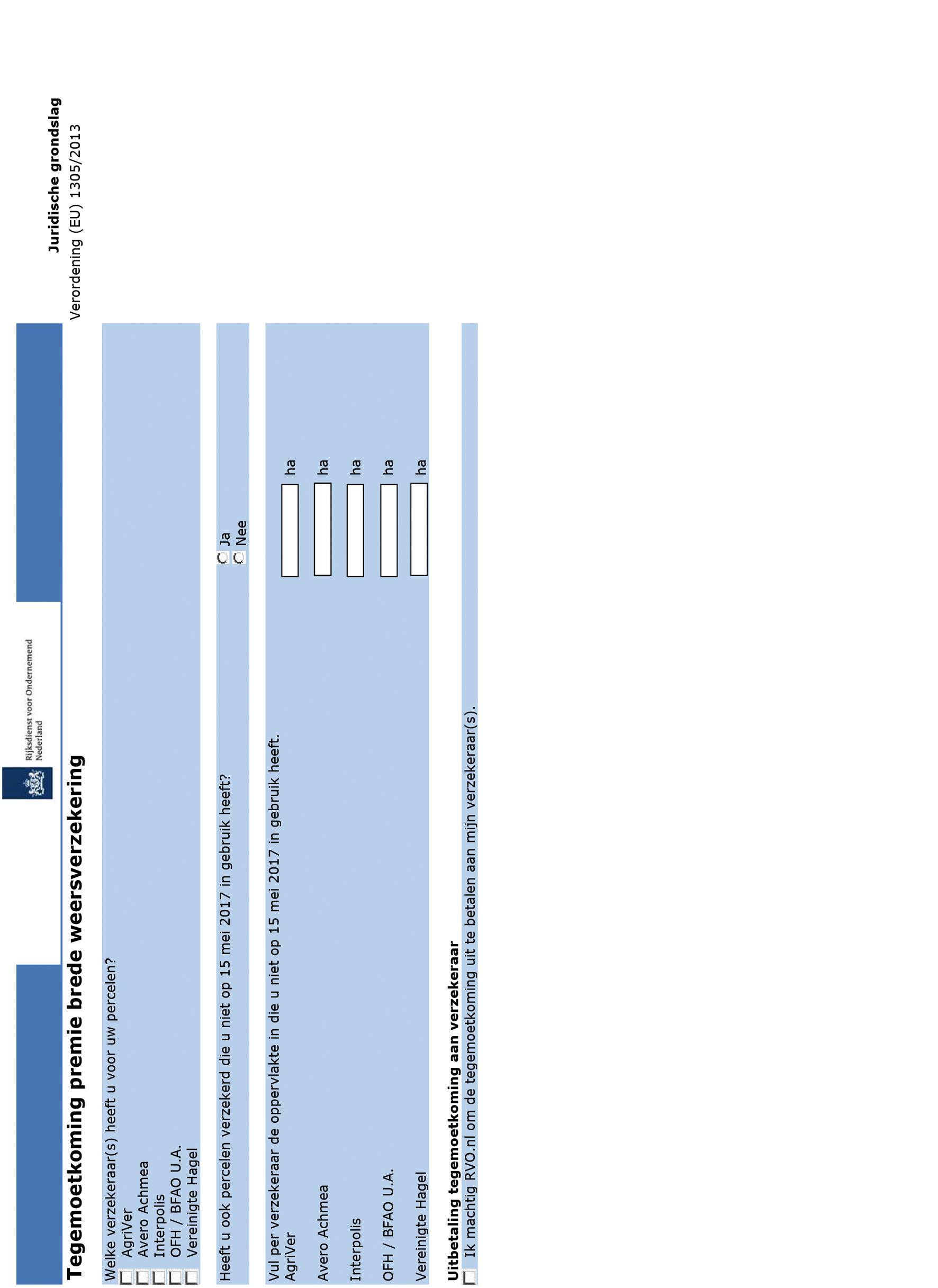 – het doen van een aanvraag voor de Brede Weersverzekering: Verordening (EU) nr. 1305/2013 van het Europees Parlement en de Raad van 17 december 2013 inzake steun voor plattelandsontwikkeling uit het Europees Landbouwfonds voor plattelandsontwikkeling (ELFPO) en tot intrekking van Verordening (EG) nr 1698/2005 van de Raad (PbEU 2013, L347) (hierna: Verordening nr. 1305/2013) en de Regeling Europese EZ-subsidies;