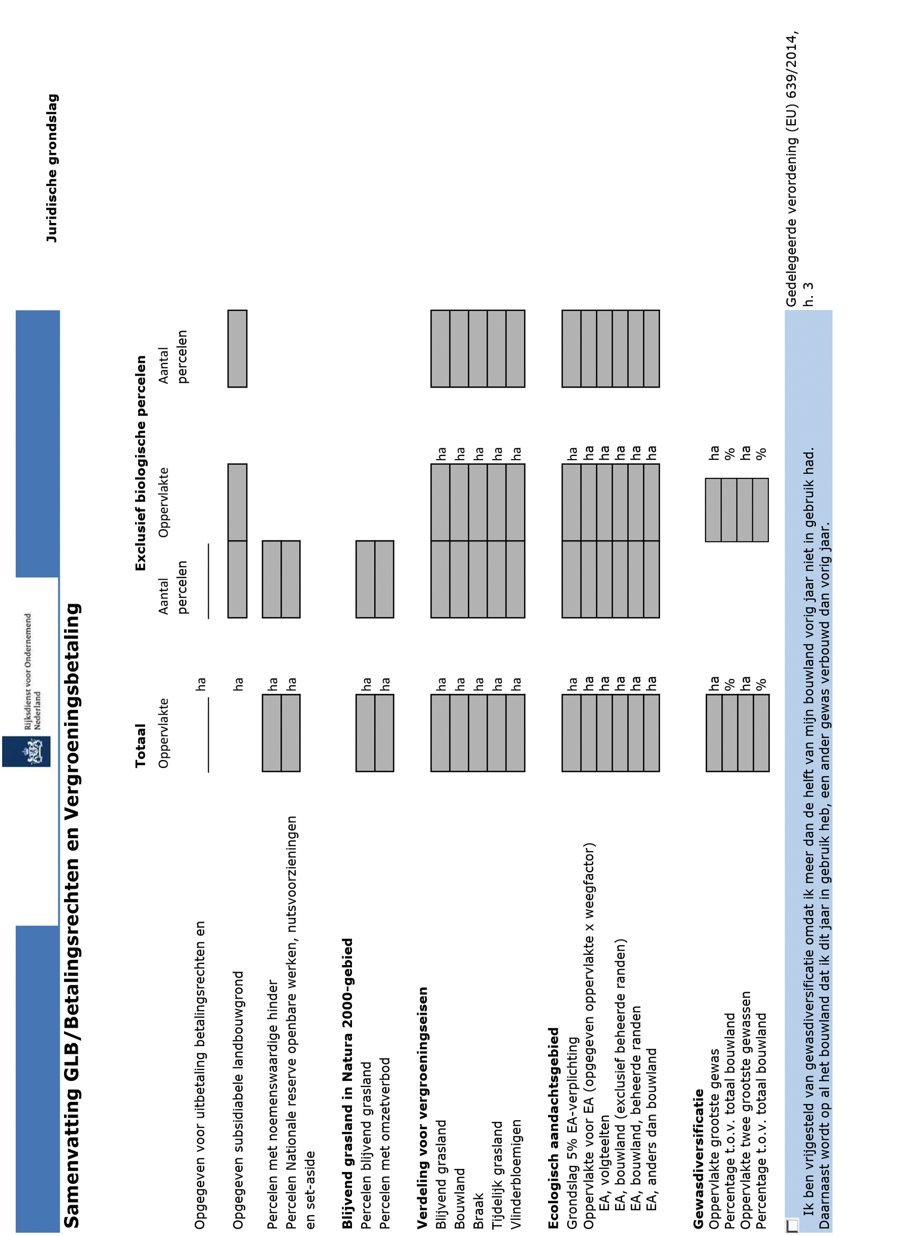 – het doen van de verzamelaanvraag voor de Uitvoeringsregeling rechtstreekse betalingen GLB (Gemeenschappelijk landbouwbeleid) op grond van Verordening (EU) nr. 1306/2013 en Verordening (EU) nr. 1307/2013 van het Europees Parlement en de Raad van 17 december 2013 tot vaststelling van voorschriften voor rechtstreekse betalingen aan landbouwers in het kader van de steunregelingen van het gemeenschappelijk landbouwbeleid en tot intrekking van Verordening (EG) nr. 637/2008 van de Raad en Verordening (EG) nr 73/2009 van de Raad (PbEU 2013, L347);