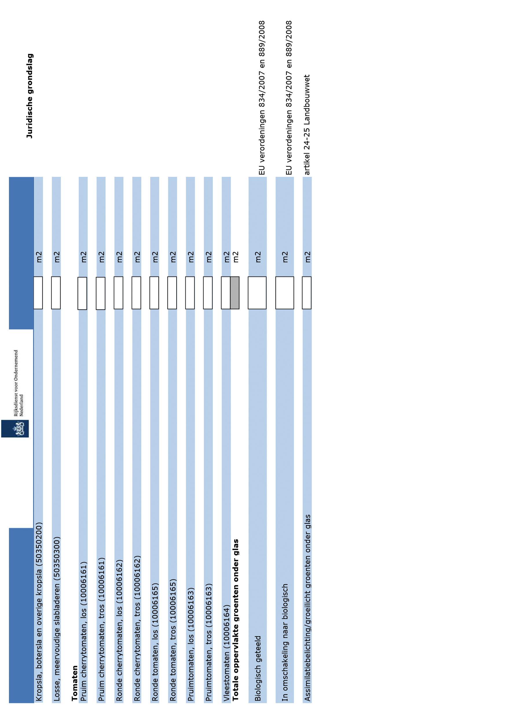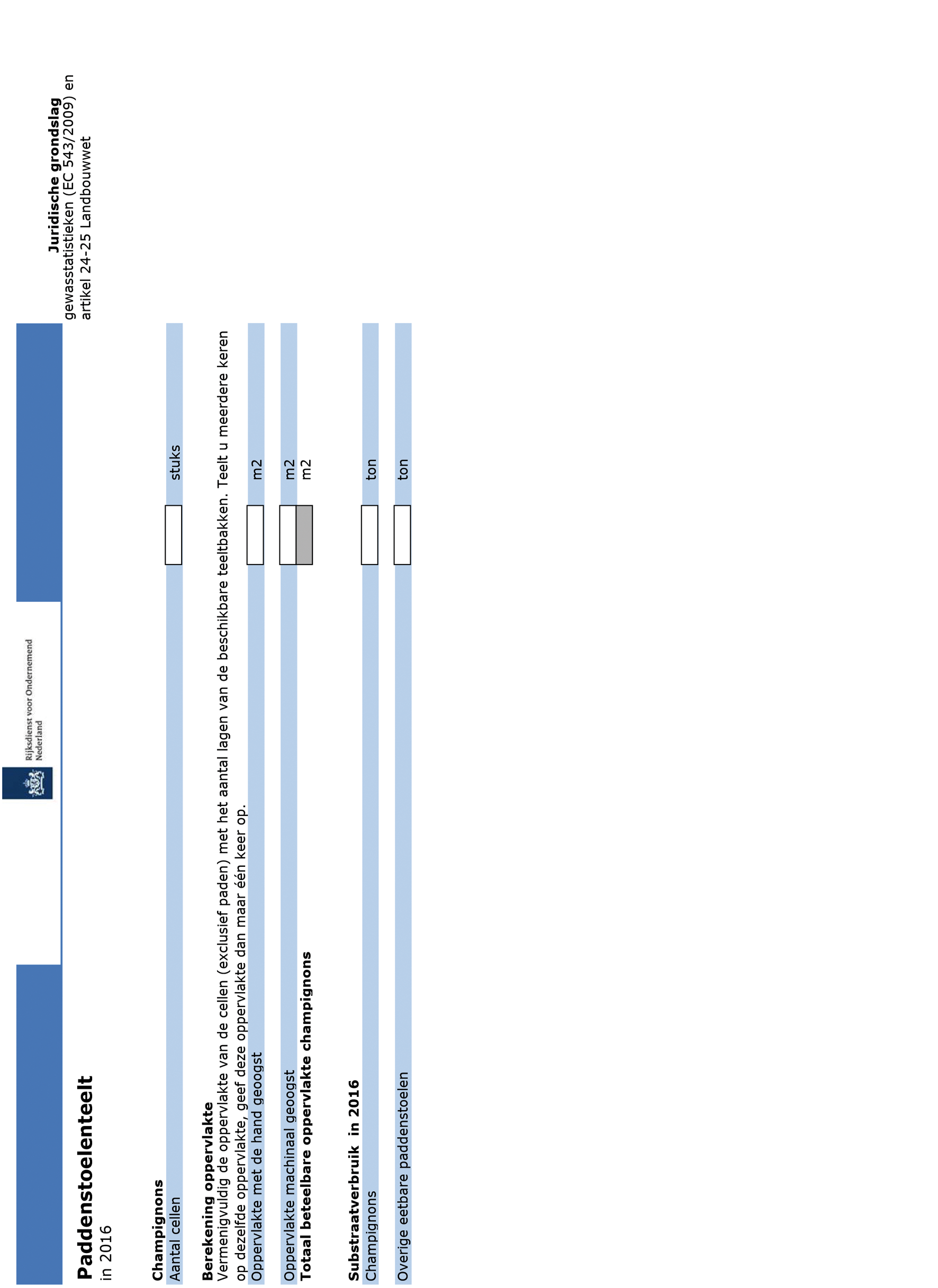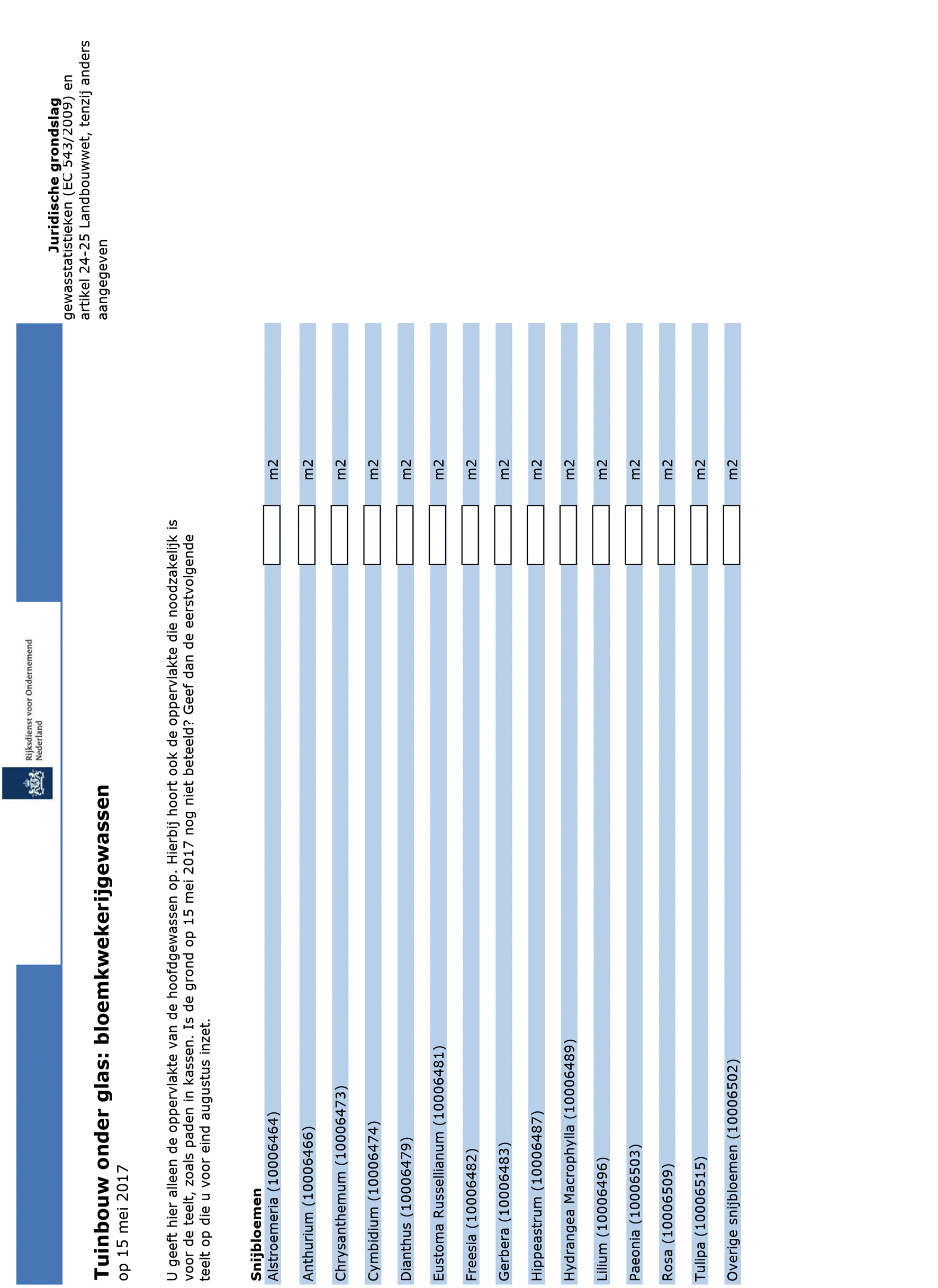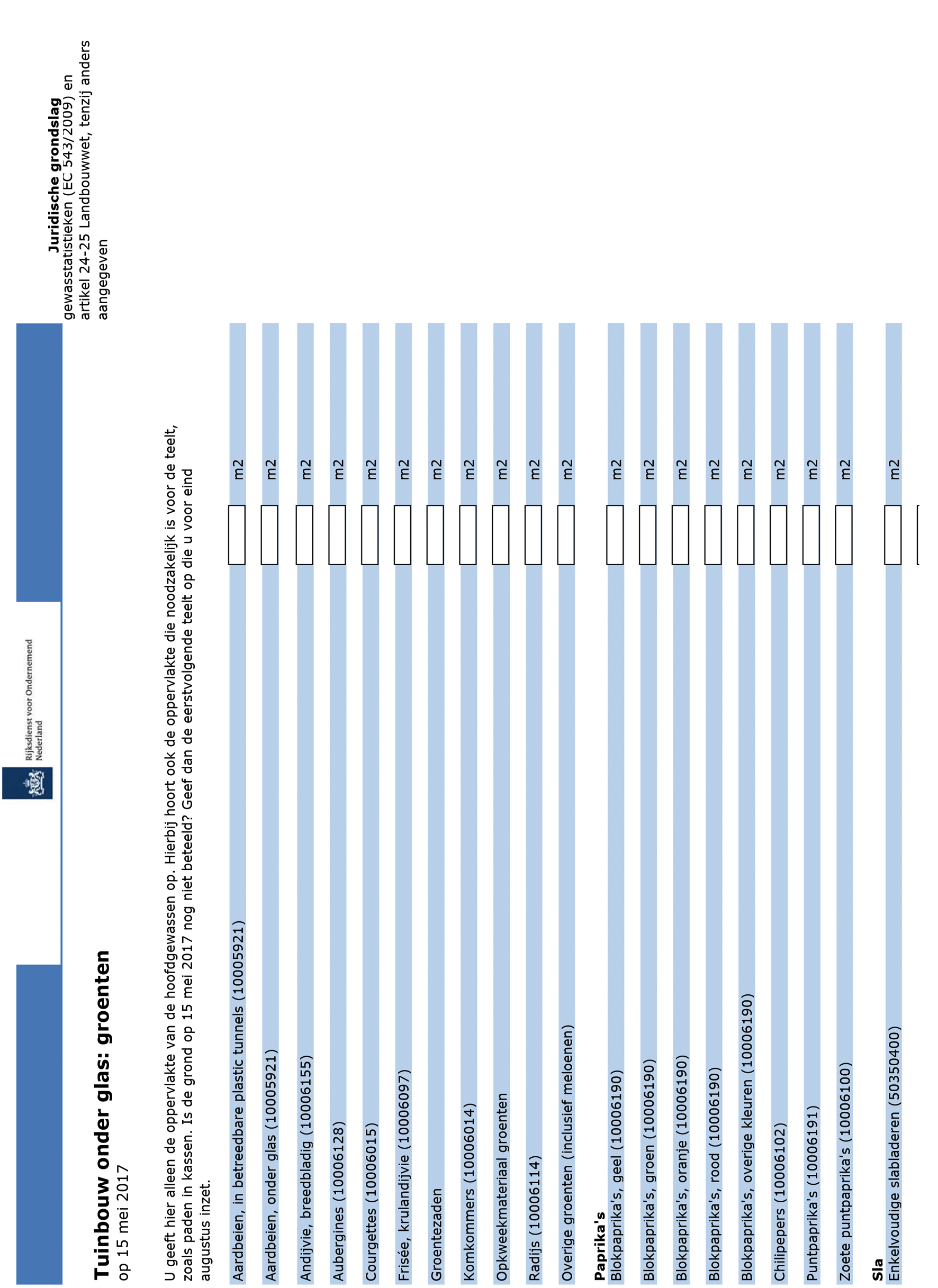 Gezien de substantiële economische omvang van de witloftrek en bollenbroei in Nederland vormen deze twee teelten een aanvulling op de Europees verplichte statistiek. Ook zijn twee vragen over assimilatieverlichting opgenomen vanwege het nationale belang. In 2017 wordt als nulmeting éénmalig een vraag opgenomen over directe levering aan de consument. Deze vraagstelling wordt in de toekomst gecombineerd met de vraag over verbrede landbouw die drie maal per 10 jaar op basis van de Europese statistische verordening wordt gesteld.