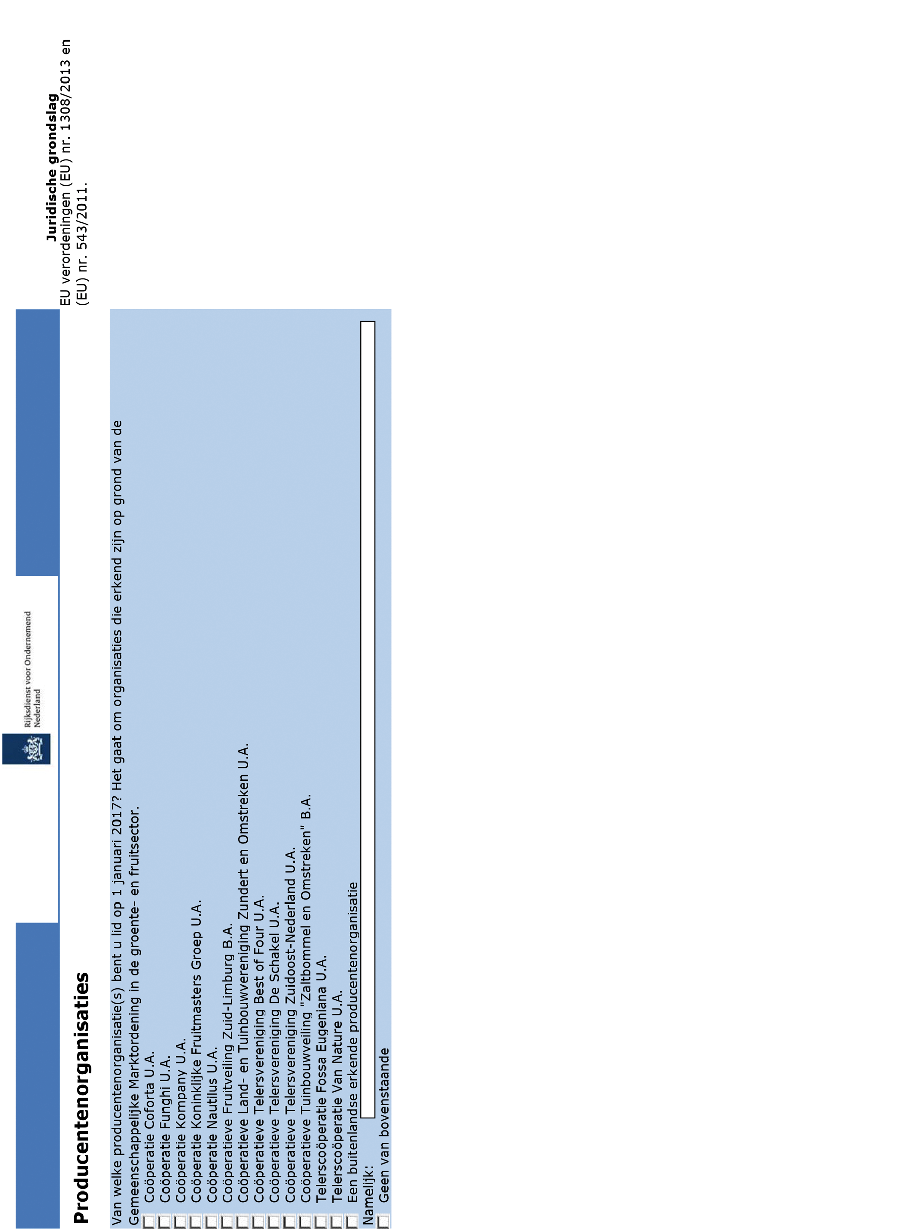 Om in aanmerking te komen voor steun in het kader van de GMO groenten en fruit moet een producentenorganisatie erkend zijn als producentenorganisatie in de zin van de GMO (artikel 32 en 152, eerste lid, van Verordening (EU) nr. 1308/2013). Een producent van groenten en fruit producten mag voor hetzelfde product slechts bij één producentenorganisatie zijn aangesloten. Het is de taak van de lidstaat om te controleren dat een producent niet bij meer dan één producentenorganisatie is aangesloten. Dit als onderdeel van de erkenningscontroles als bedoeld in artikel 104, eerste lid, en de controles die worden uitgevoerd voorafgaand aan uitbetaling van de steunaanvraag als bedoeld in de artikelen 105, eerste lid, en 106, eerste lid, aanhef en onderdeel a, van verordening (EU) nr. 543/2011. Door de vraag in de Gecombineerde opgave wordt controle vanuit één bestand mogelijk en vermindert het controlerisico. De aanzienlijke vermindering in uitvoeringslast en de beperking van het controlerisico rechtvaardigen de minieme toename van de administratieve lasten voor de sector. De minister is op grond van artikel 15, gelezen in samenhang met artikel 13, eerste lid, onderdeel b, van de Landbouwwet bevoegd om regels te stellen ten behoeve van uitvoering van verordeningen 543/2013 en 1308/2013.